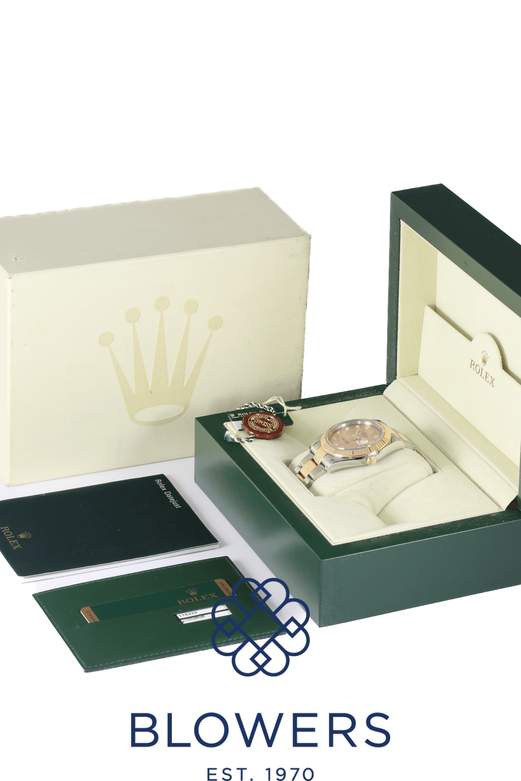 Rolex Oyster Perpetual Datejust II 116333. Stainless steel and 18ct yellow gold 41 mm diameter Oyster case with screw-down crown, Twinlock double waterproofness system, water resistant up to 100 metres. Self-winding chronometer-certified calibre 3136 movement with Parachrom hairspring and Paraflex shock absorbers, offering a 48-hour power reserve. Fixed fluted bezel in 18ct yellow gold. Champagne dial set with 10 factory round brilliant-cut diamond hour markers in yellow gold settings. Central hours, minutes and seconds hands with Chromalight luminescence. Date window at the 3 o’clock position, enhanced by Cyclops lens. Scratch-resistant sapphire crystal glass. Stainless steel and 18ct yellow gold Oyster bracelet with flat three-piece links, secured by Oysterclasp and Easylink comfort extension system. Box and papers dated November 2009.