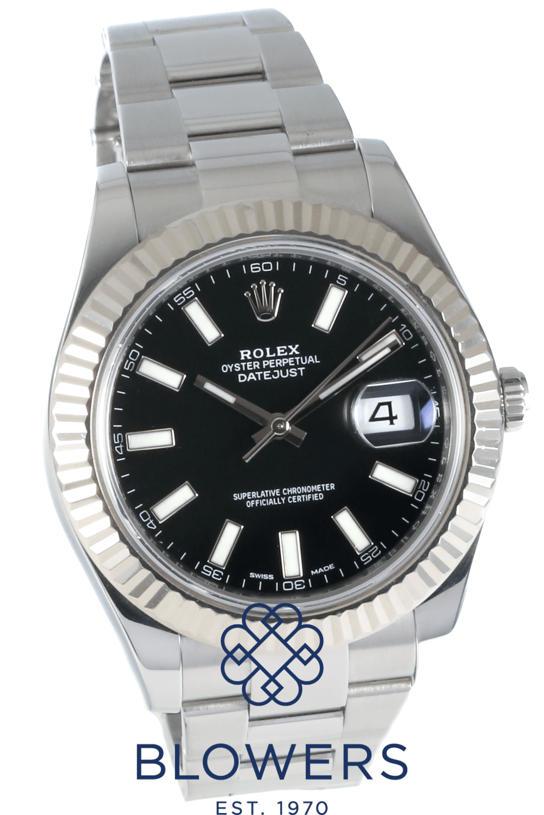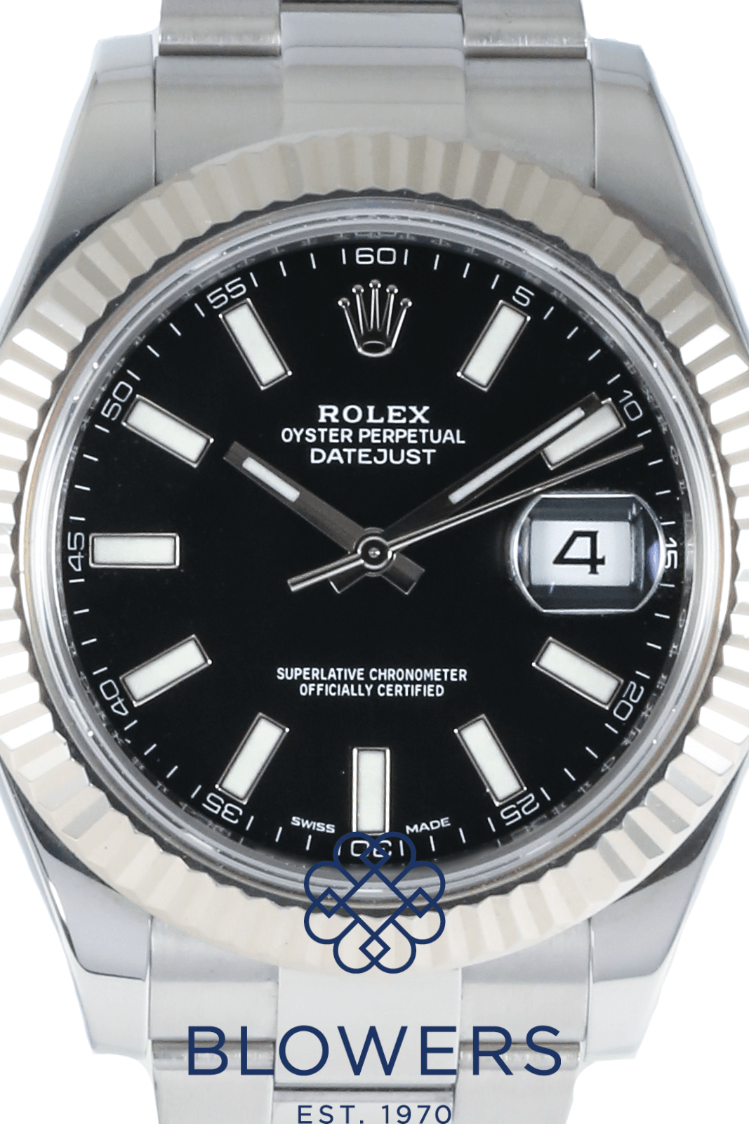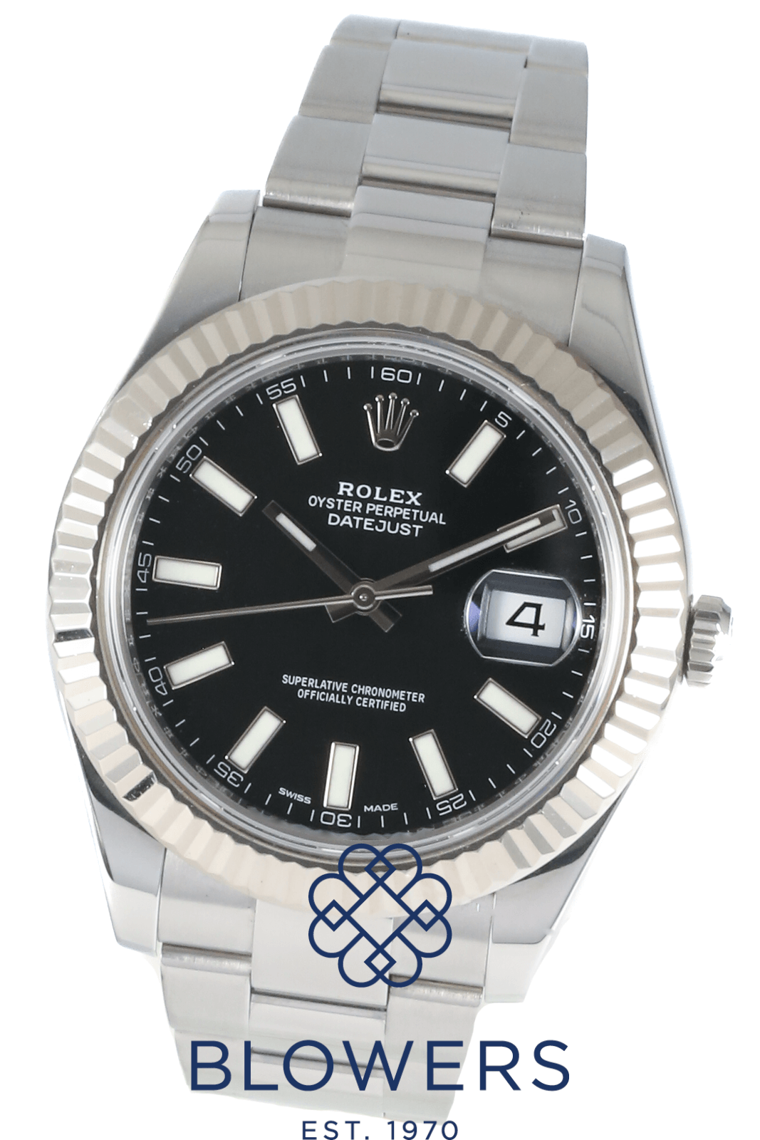 Rolex Oyster Perpetual Datejust II 116334. Stainless steel 41mm diameter Oyster case with 18ct white gold fluted bezel. Screw-down crown with Twinlock double waterproofness system. Water resistant up to 100 metres. Self-winding Rolex calibre 3136 movement, certified Swiss chronometer (COSC), offering a 48-hour power reserve. Scratch-resistant sapphire crystal glass with Cyclops lens over the date window at the 3 o’clock position for enhanced readability. Black dial with applied white gold hour markers and luminescent hands. Central hours, minutes, and seconds hands. Fitted with a stainless steel Oyster bracelet featuring polished centre links, brushed outer links, and an Oysterclasp with Easylink 5mm comfort extension link. Box and papers dated November 2015.