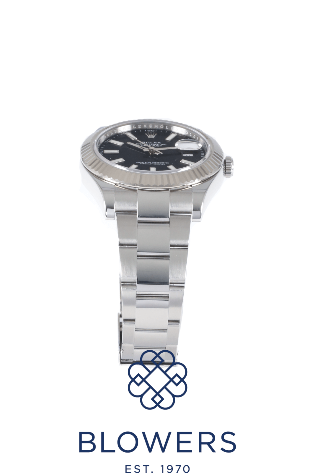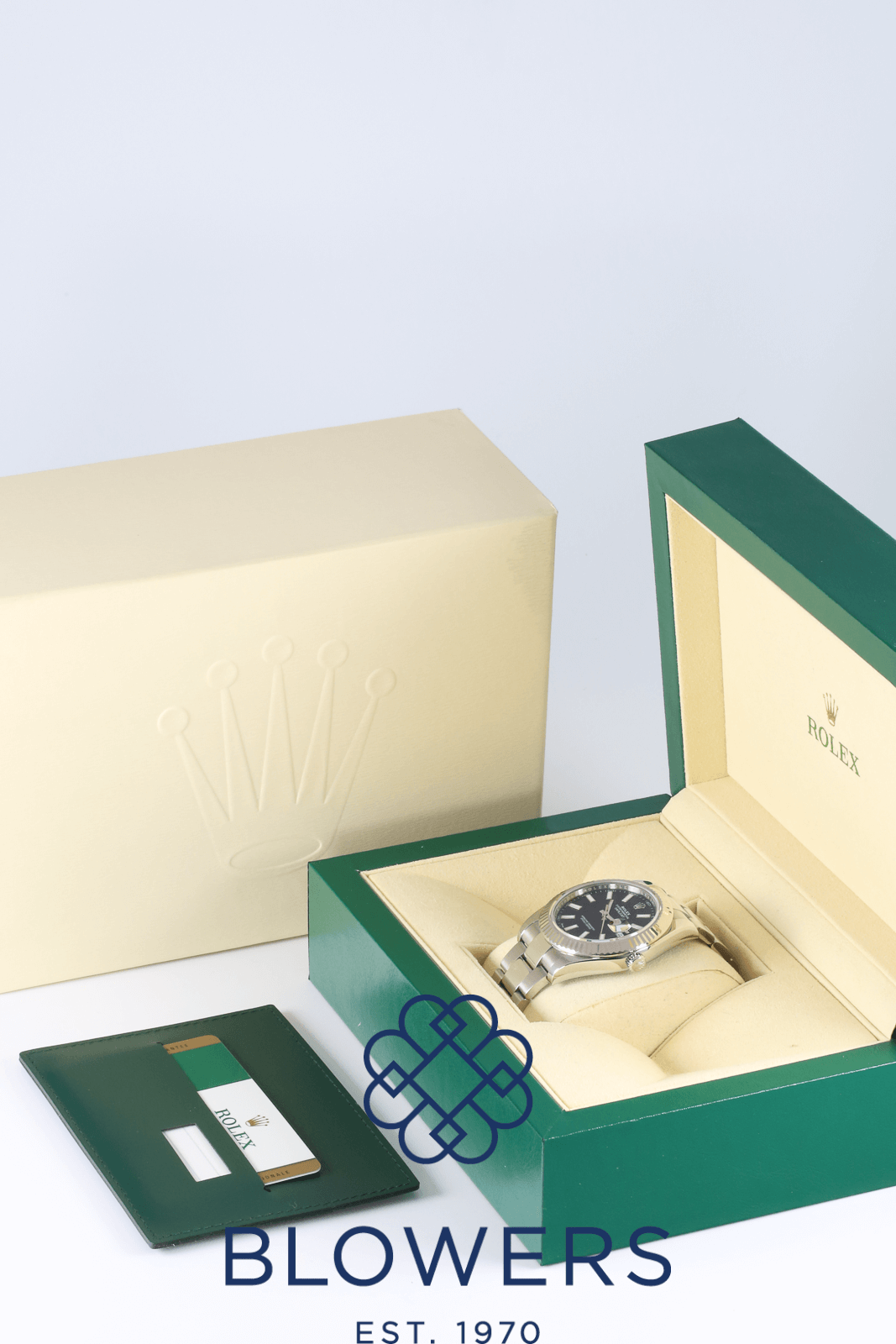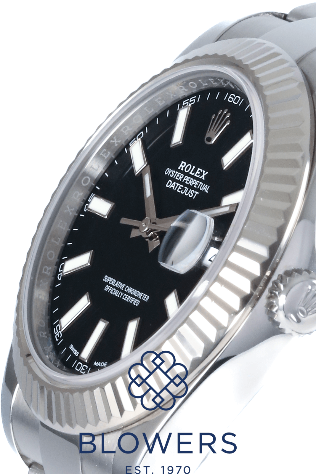 Rolex Oyster Perpetual Datejust II 116334. Stainless steel 41mm diameter Oyster case with 18ct white gold fluted bezel. Screw-down crown with Twinlock double waterproofness system. Water resistant up to 100 metres. Self-winding Rolex calibre 3136 movement, certified Swiss chronometer (COSC), offering a 48-hour power reserve. Scratch-resistant sapphire crystal glass with Cyclops lens over the date window at the 3 o’clock position for enhanced readability. Black dial with applied white gold hour markers and luminescent hands. Central hours, minutes, and seconds hands. Fitted with a stainless steel Oyster bracelet featuring polished centre links, brushed outer links, and an Oysterclasp with Easylink 5mm comfort extension link. Box and papers dated November 2015.