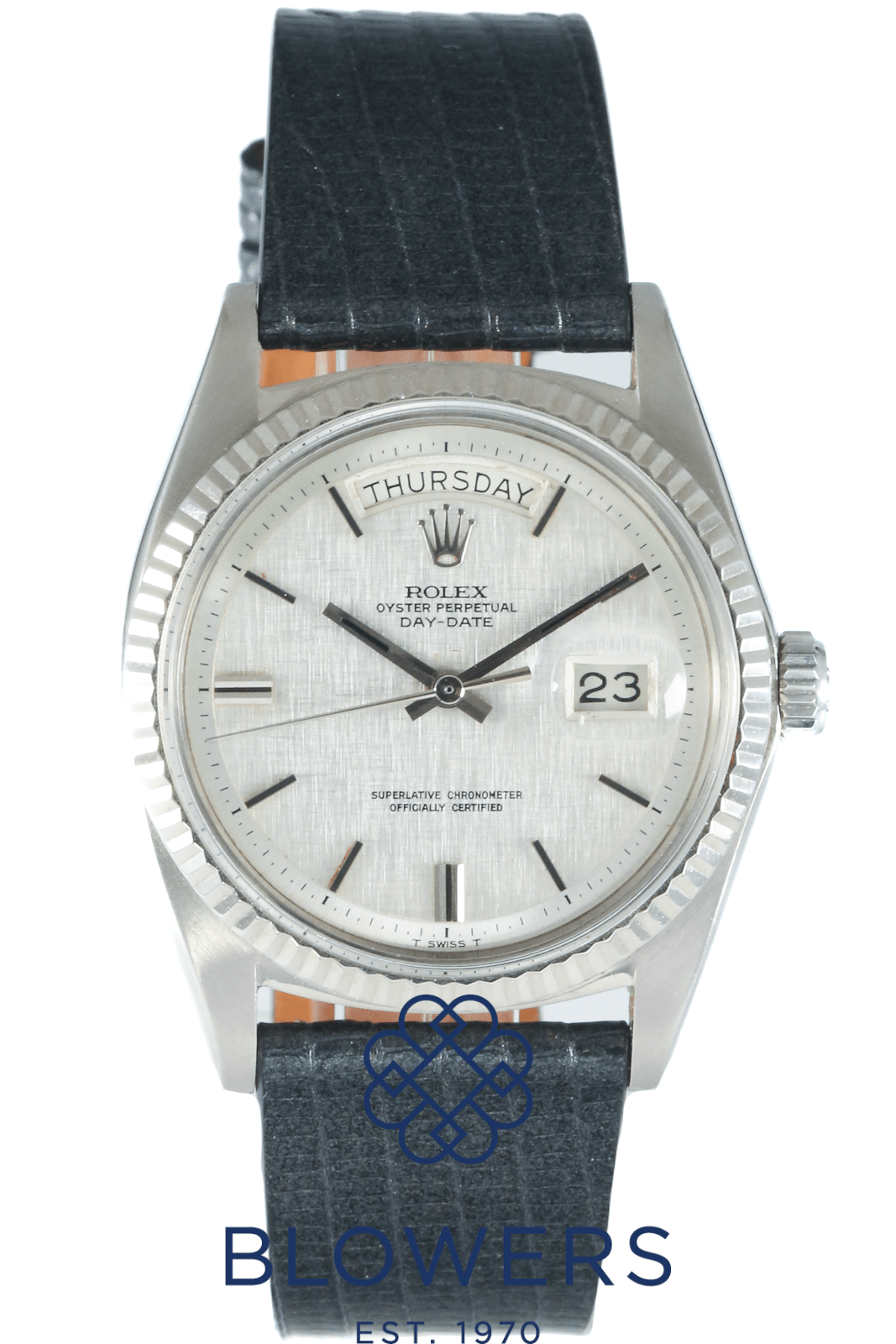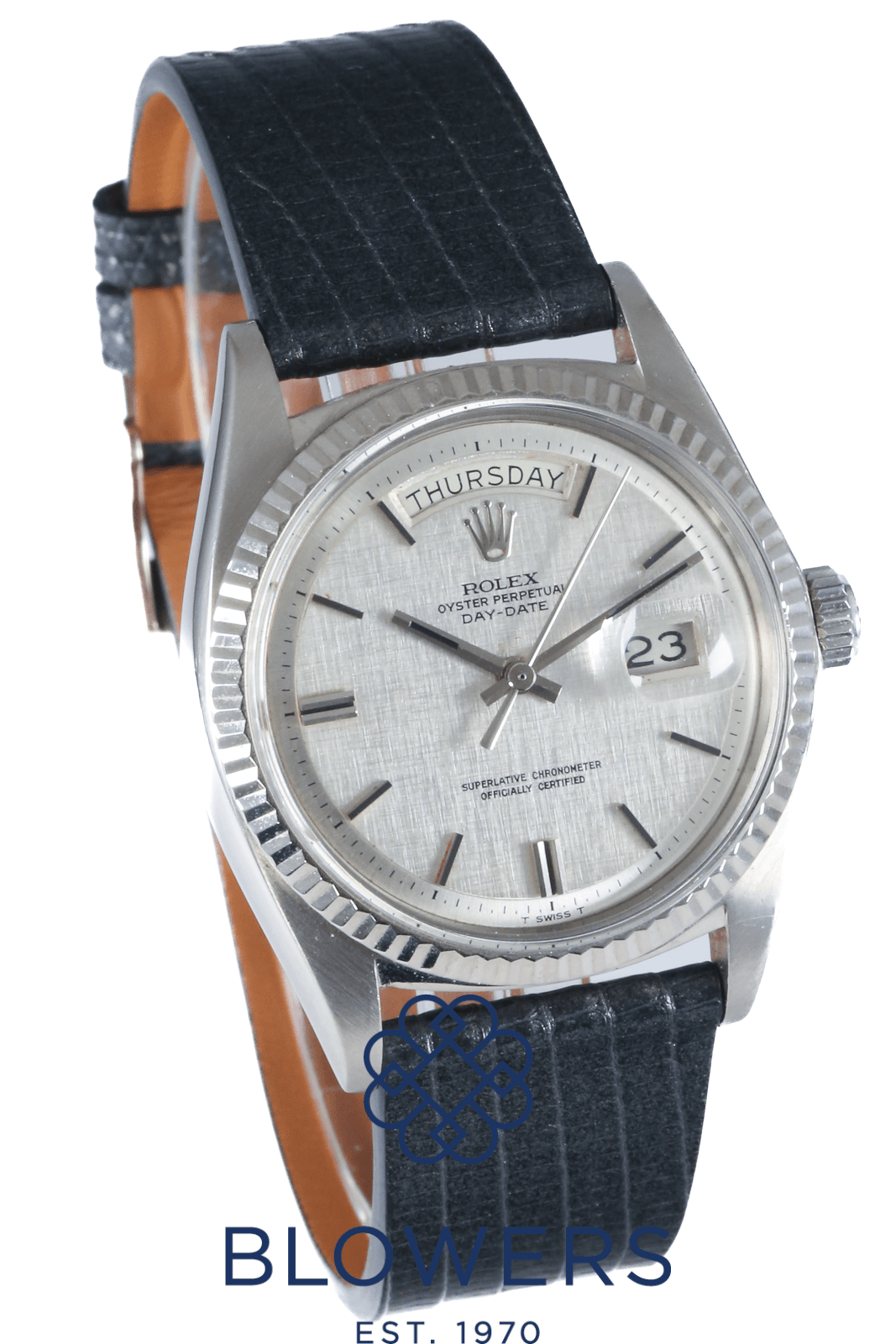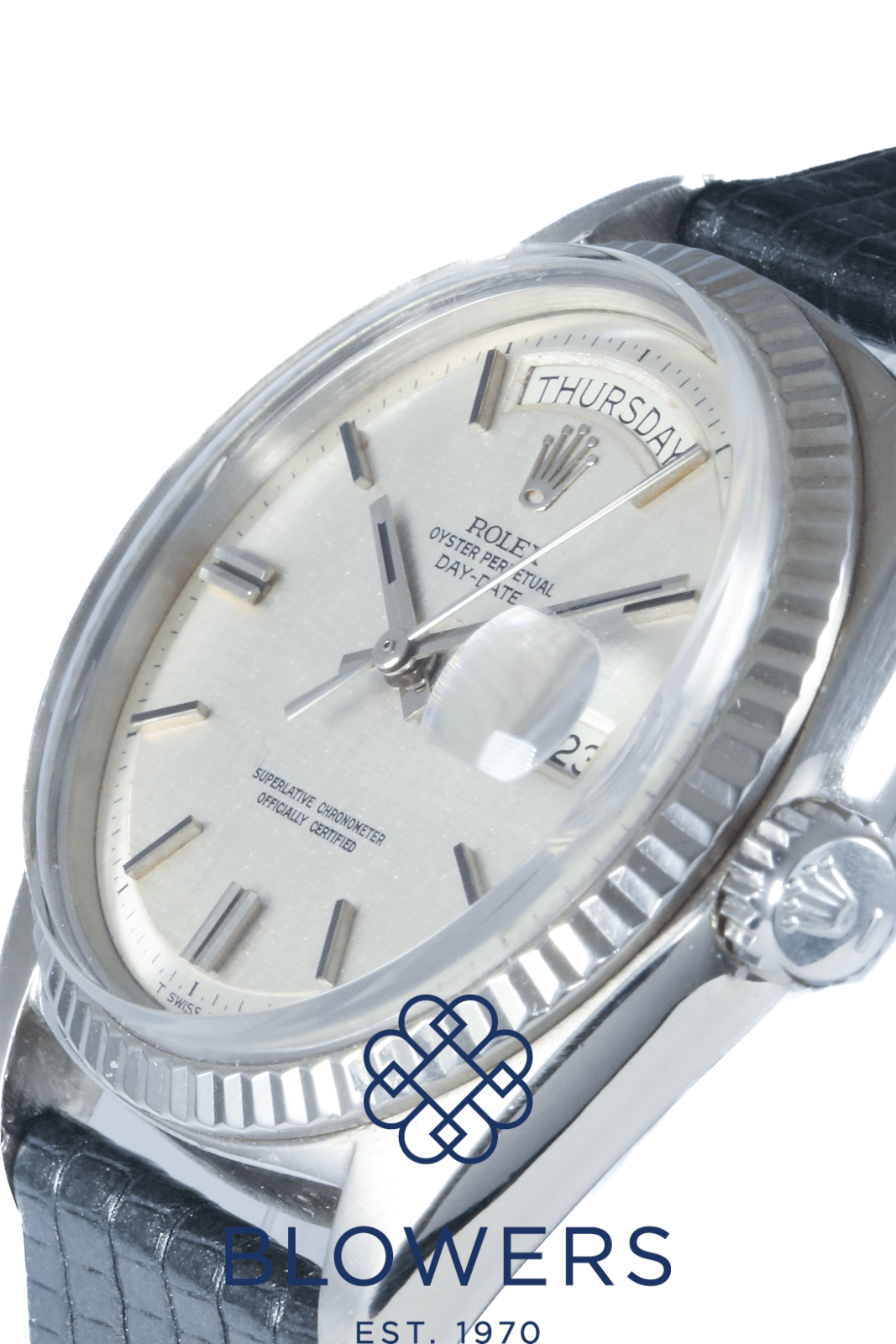 Rolex Oyster Perpetual Day-Date 1803. 18ct white gold 36mm diameter case with screw-down crown, water resistant up to 100 metres. Self-winding chronometer-certified calibre 1556 movement with approximately 48-hour power reserve. Fluted 18ct white gold bezel. Silver linen-textured dial signed “T SWISS T” at 6 o’clock, without tritium lume application. Applied baton hour markers and hands inlaid with black onyx, with distinctive double-width ‘door-stop’ batons at 6 and 9 o’clock. Central hours, minutes, and seconds hands. Day aperture displayed in full at the 12 o’clock position and date window at 3 o’clock with instantaneous change mechanism. Scratch-resistant acrylic crystal with Cyclops magnifier over the date. Presented on a zirconium-grey lizard strap with 18ct white gold Rolex buckle with the iconic and large 5-pointed Rolex crown. An additional grey alligator strap with alligator strap with quick-release bars is also included. Box only. Circa 1972.
