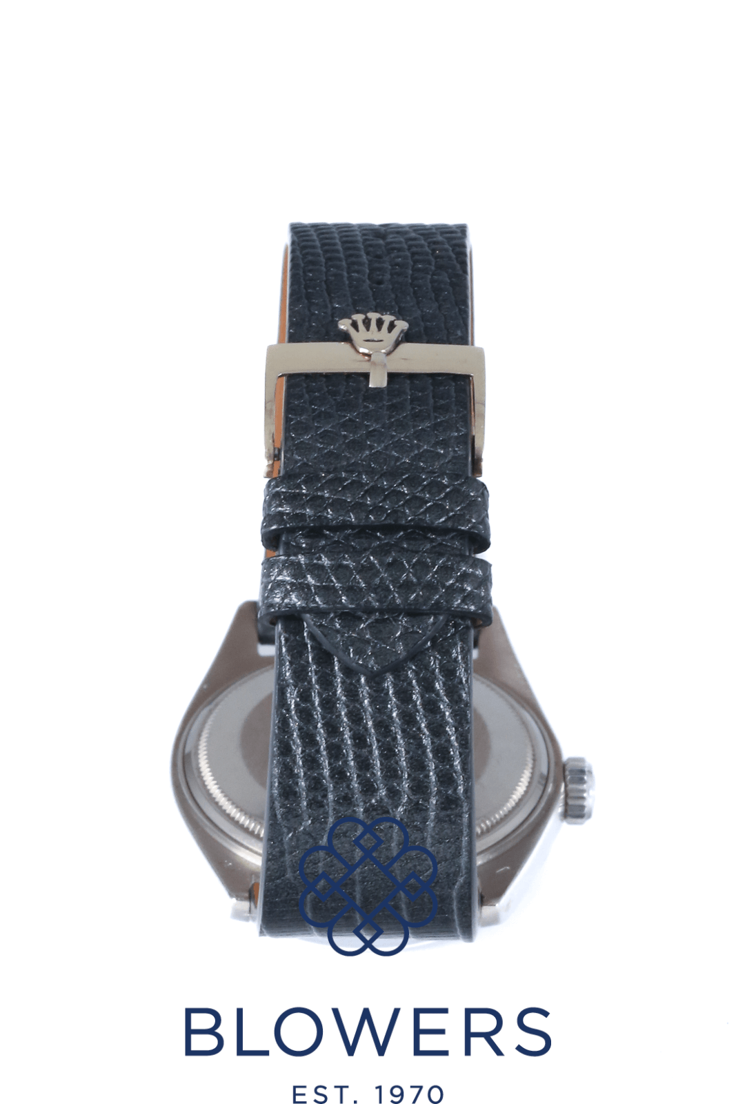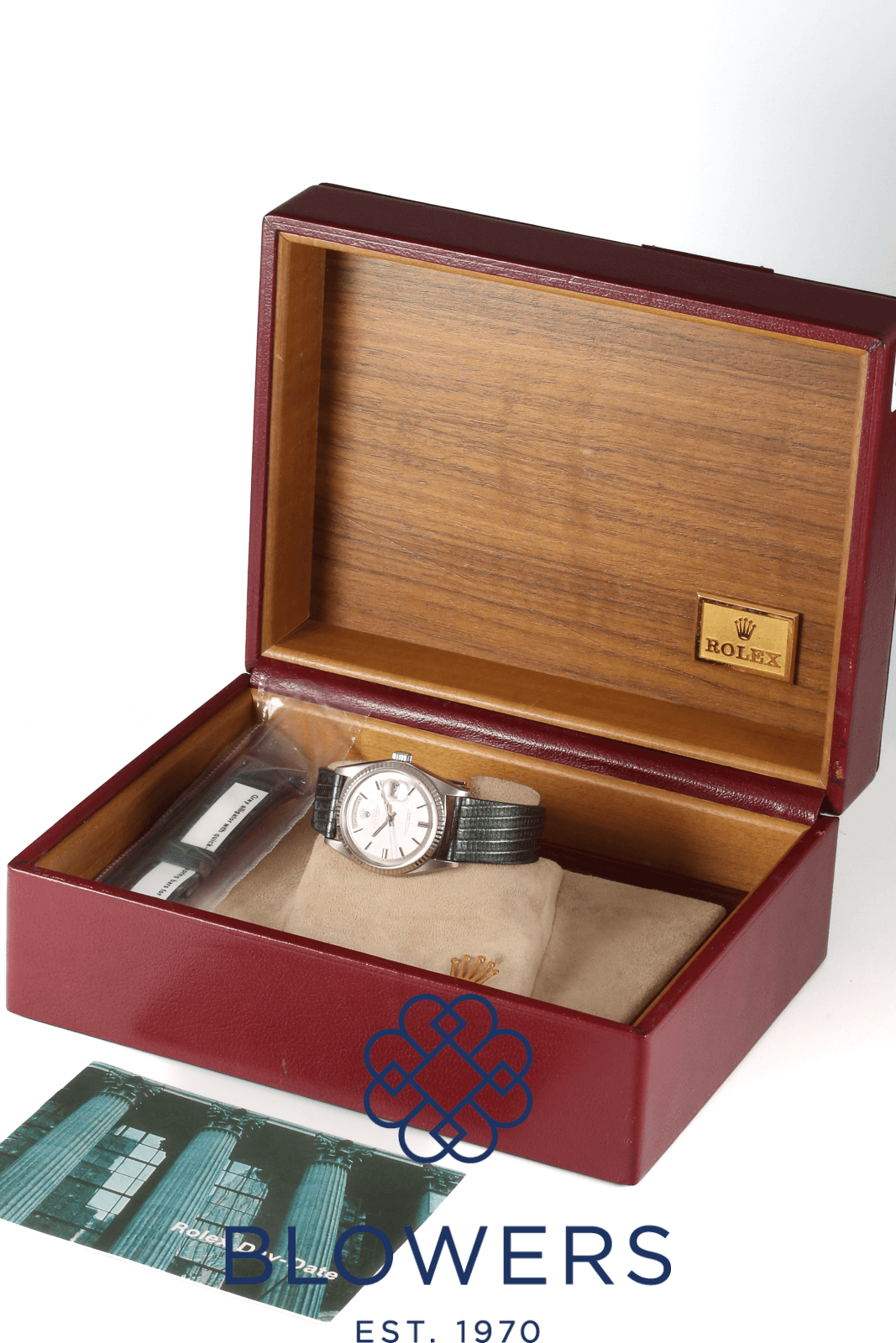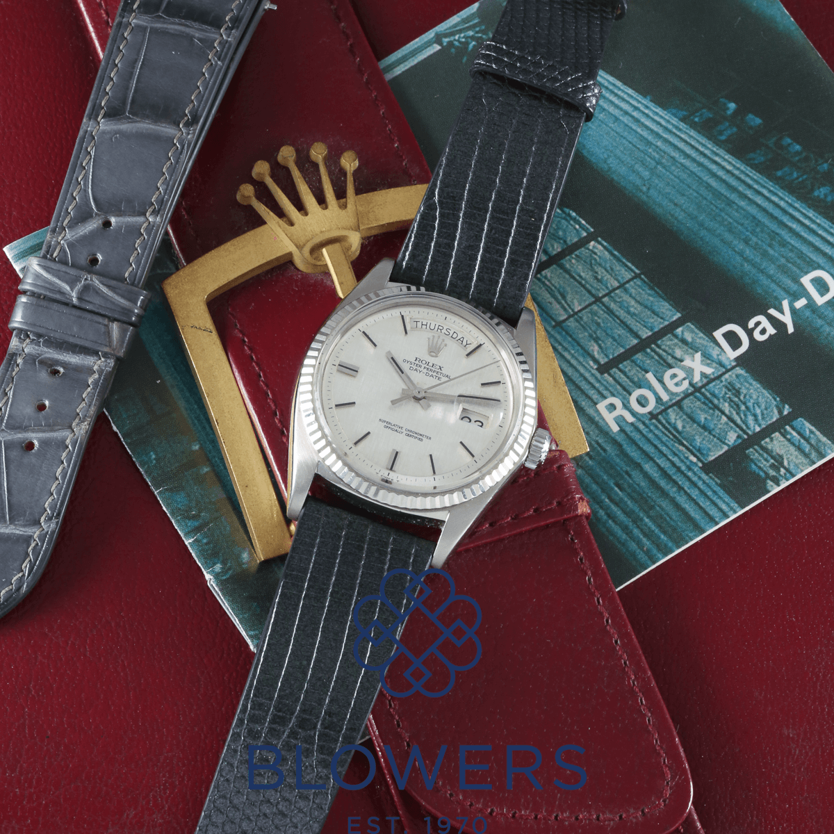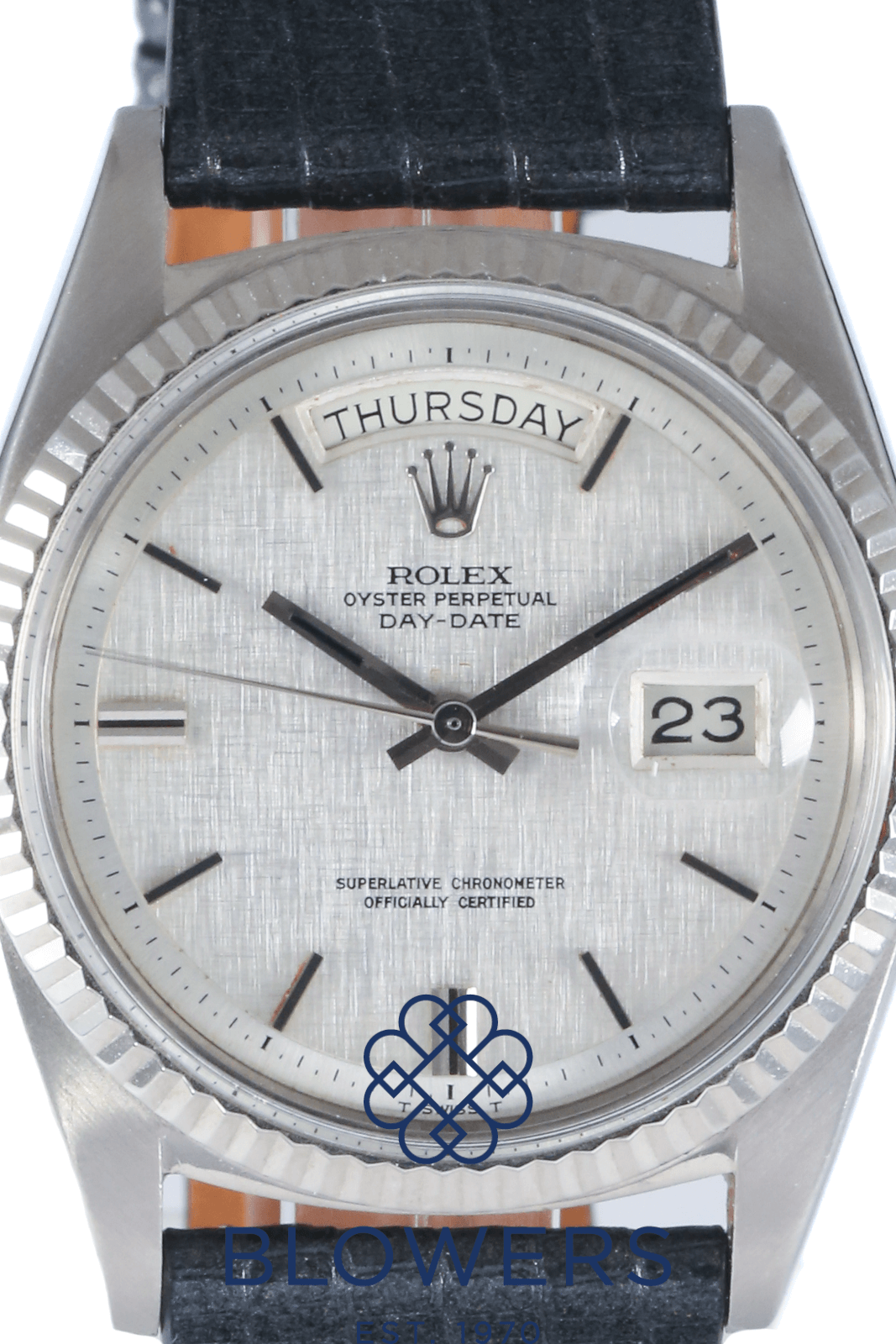 Rolex Oyster Perpetual Day-Date 1803. 18ct white gold 36mm diameter case with screw-down crown, water resistant up to 100 metres. Self-winding chronometer-certified calibre 1556 movement with approximately 48-hour power reserve. Fluted 18ct white gold bezel. Silver linen-textured dial signed “T SWISS T” at 6 o’clock, without tritium lume application. Applied baton hour markers and hands inlaid with black onyx, with distinctive double-width ‘door-stop’ batons at 6 and 9 o’clock. Central hours, minutes, and seconds hands. Day aperture displayed in full at the 12 o’clock position and date window at 3 o’clock with instantaneous change mechanism. Scratch-resistant acrylic crystal with Cyclops magnifier over the date. Presented on a zirconium-grey lizard strap with 18ct white gold Rolex buckle with the iconic and large 5-pointed Rolex crown. An additional grey alligator strap with alligator strap with quick-release bars is also included. Box only. Circa 1972.