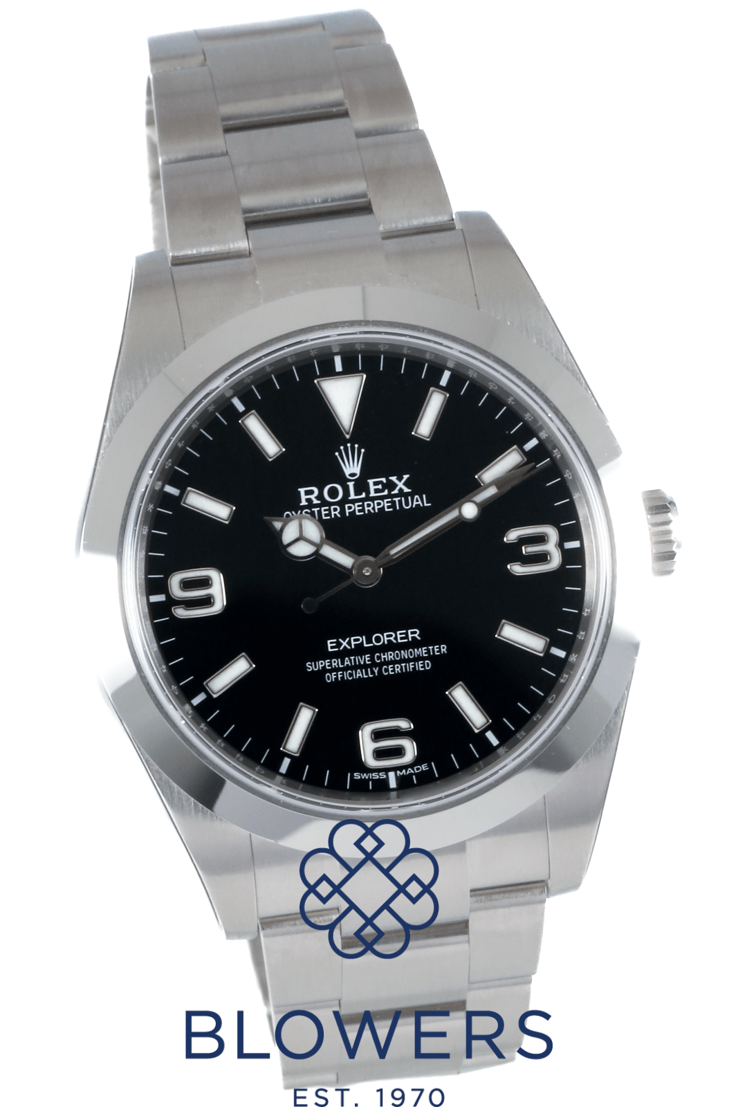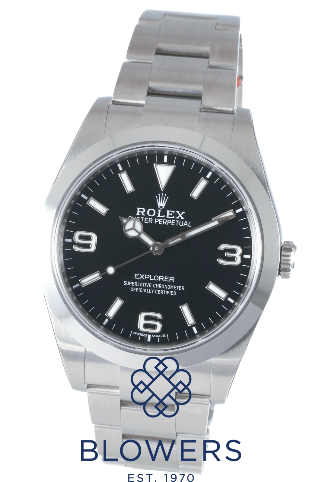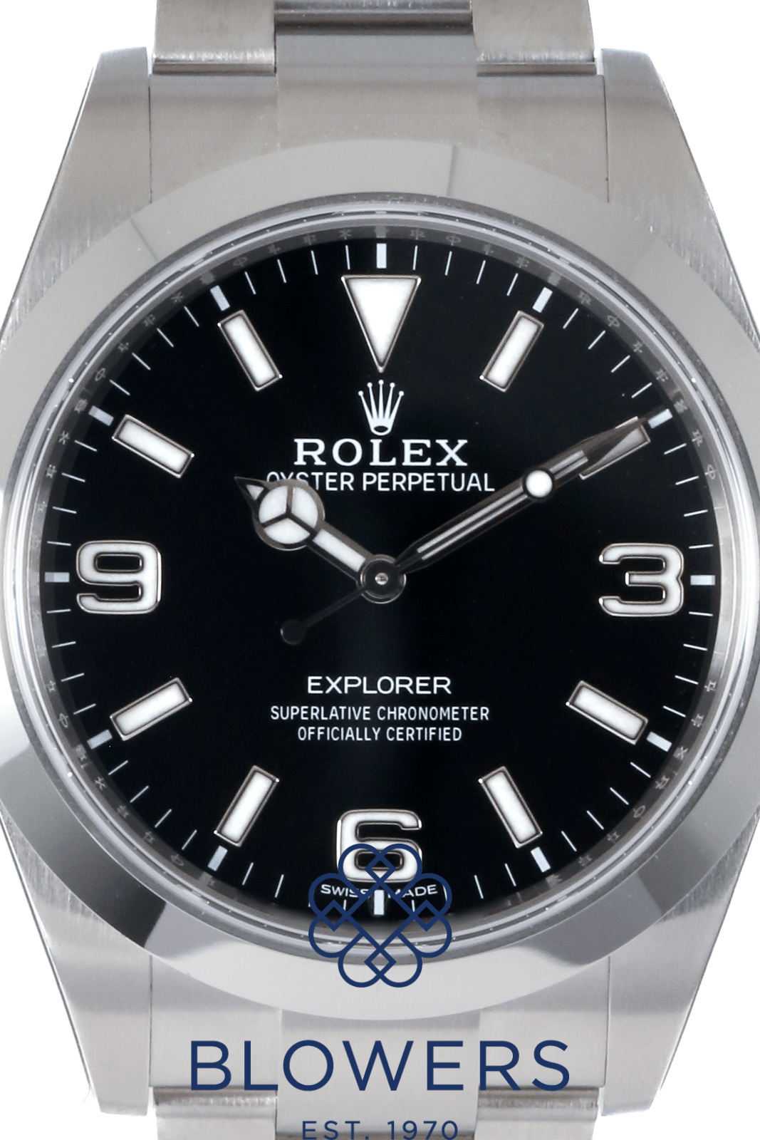 Rolex Oyster Perpetual Explorer 214270. Fully factory sealed. Steel 39mm case. Polished steel bezel. Automatic chronometer movement with parachrom hairspring. Black dial with applied luminous hour markers and Arabic numerals with luminous hands, central second sweep. Water resistant to 100 meters. Brushed steel oyster bracelet with oyster fliplock clasp. Box and papers dated October 2017.