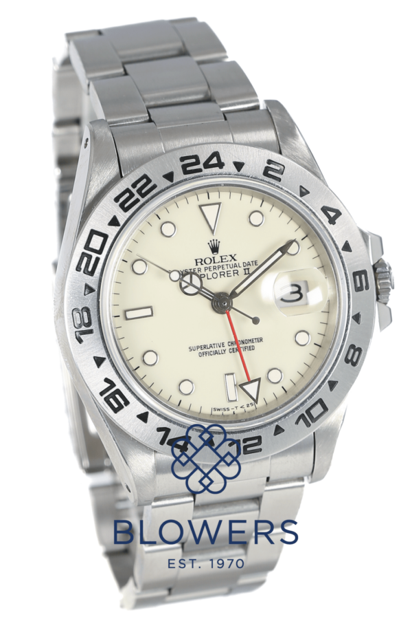 Rolex Oyster Perpetual Explorer II 16550 circa 1985. 40mm steel casing, which is water resistant to 100 meters. Automatic Rolex calibre movement. Featuring an aged, cream “Panna” dial with luminous tritium hour markers and hands. Third red arrow hand for GMT function. Surrounded by a 24 hour graduated fixed, steel bezel. With central hours, minutes and seconds hands; a cyclops lens date window at the 3 o’clock position. Upon a steel oyster bracelet, with a folding clasp. Complete with its box, Rolex service papers dated August 2013. Specialist service dated February 2024.