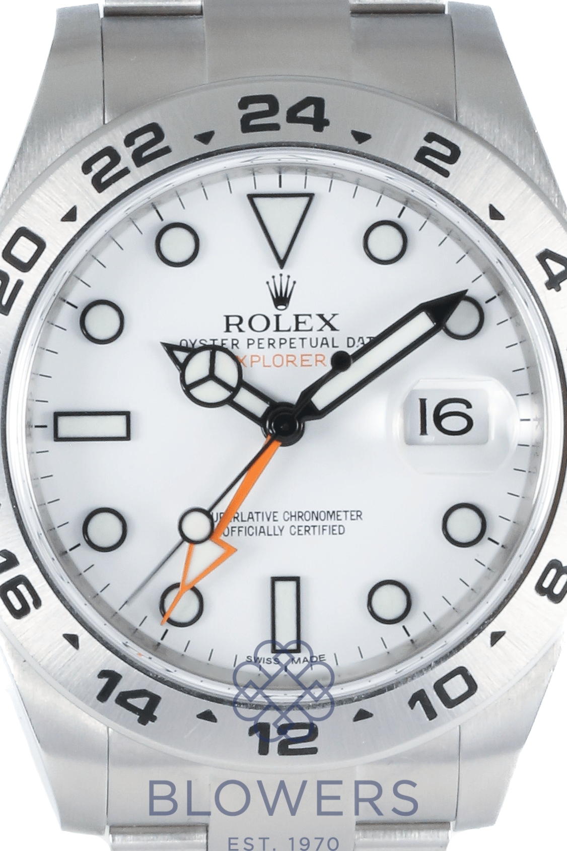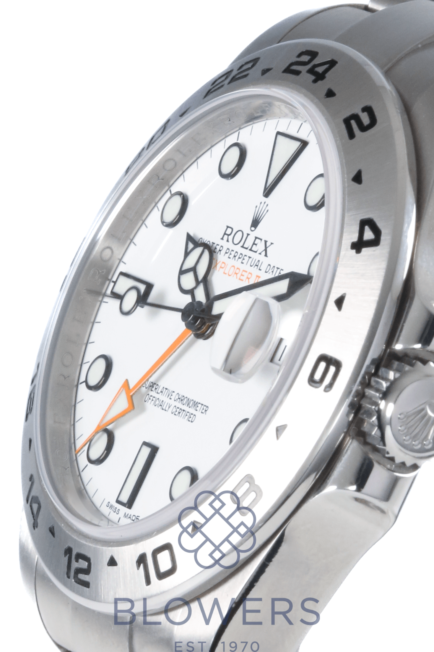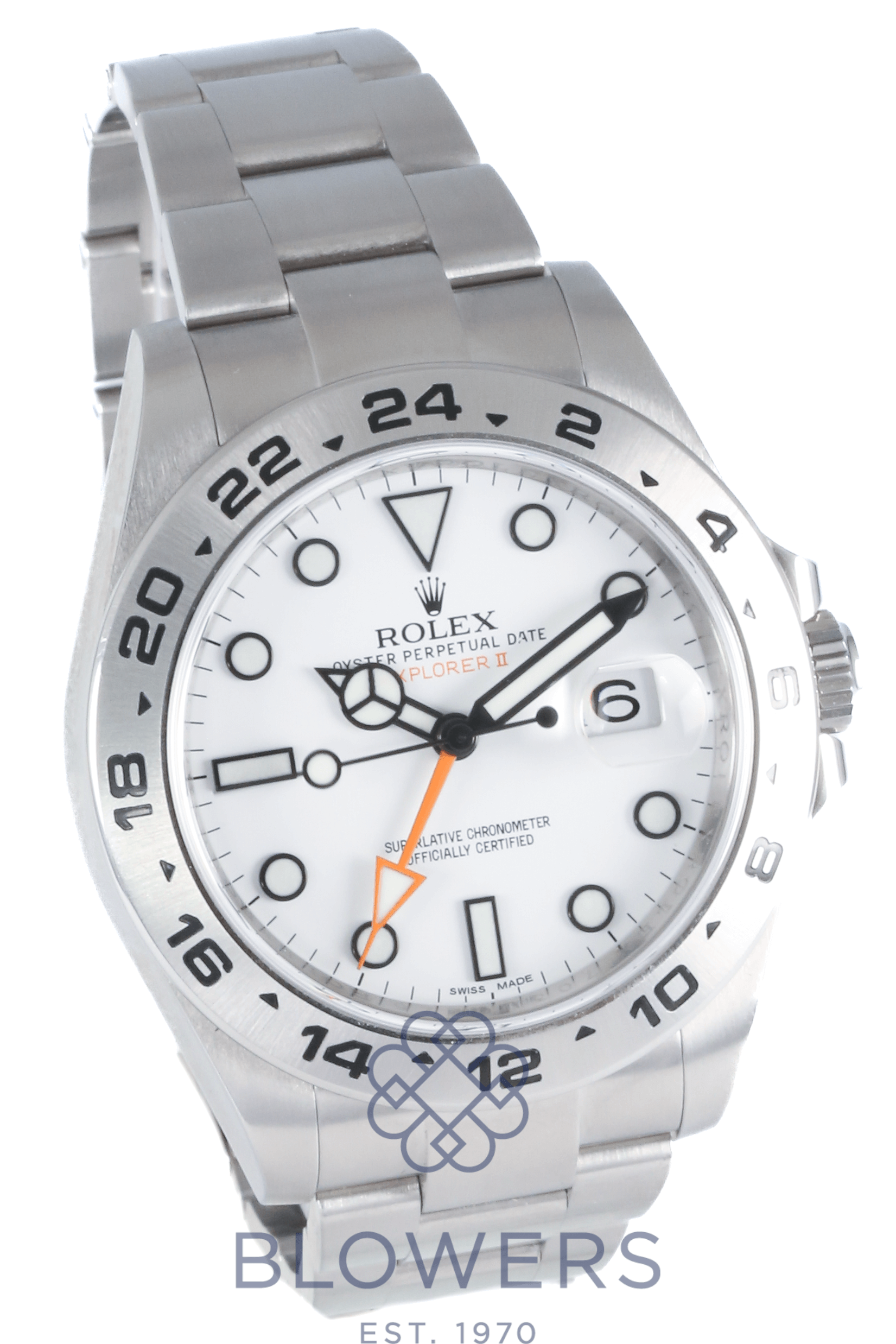 Rolex Oyster Perpetual Explorer II 216570. 42mm steel case which is water resistant to 100 meters. Automatic Rolex calibre 3187 movement. 31 jewels ; a power reserve of 48 hours. White maxi dial with luminous index hour markers. Luminous hours and minutes hands. Other features include a central seconds hand, a cyclops lens date window at three o ‘clock, and a third orange arrow hand for GMT function. Fixed steel bezel with a 24 hour graduation scale. Steel oyster bracelet with a folding clasp. Box and papers dated February 2016.