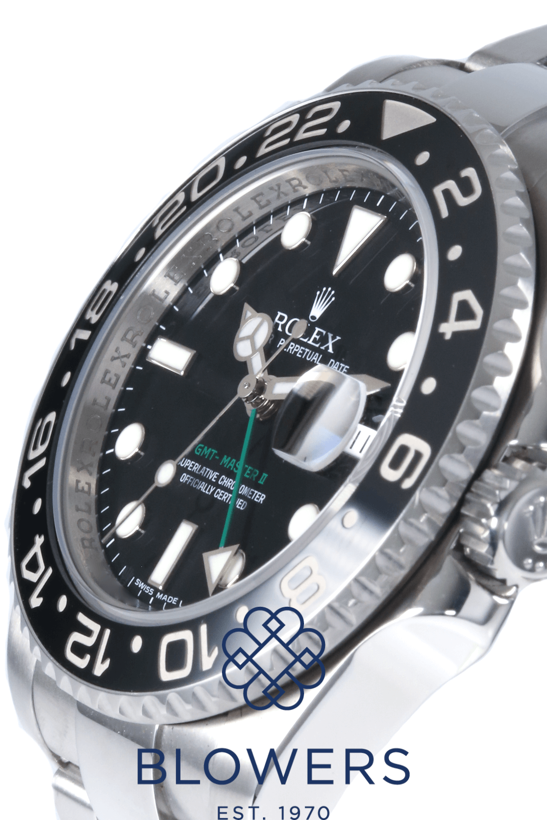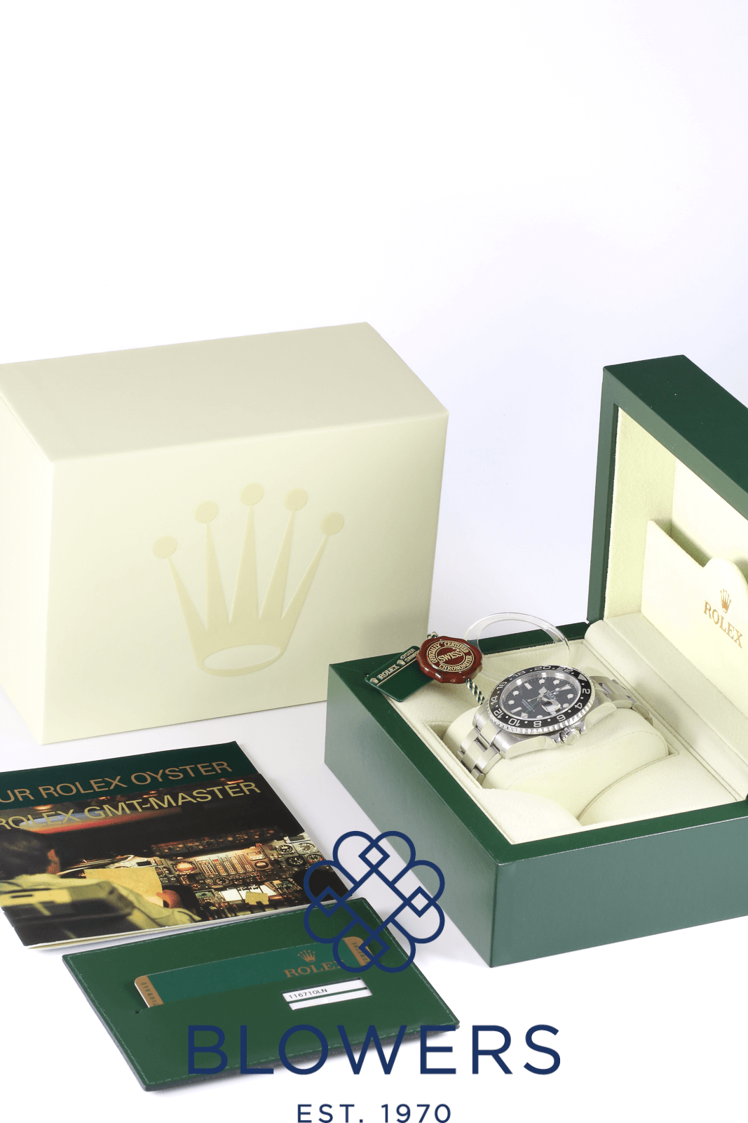 Rolex Oyster Perpetual GMT-Master II 116710LN. 40mm steel case, water resistant to 100M. Automatic Chronometer Movement. Black Dial With Maxi Luminous Hour Markers And Luminous Hands. Black Ceramic Bi-Directional Bezel. Polished And Brushed Steel Oyster Lock Bracelet With Comfort Extension Link. Box and papers dated July 2007.