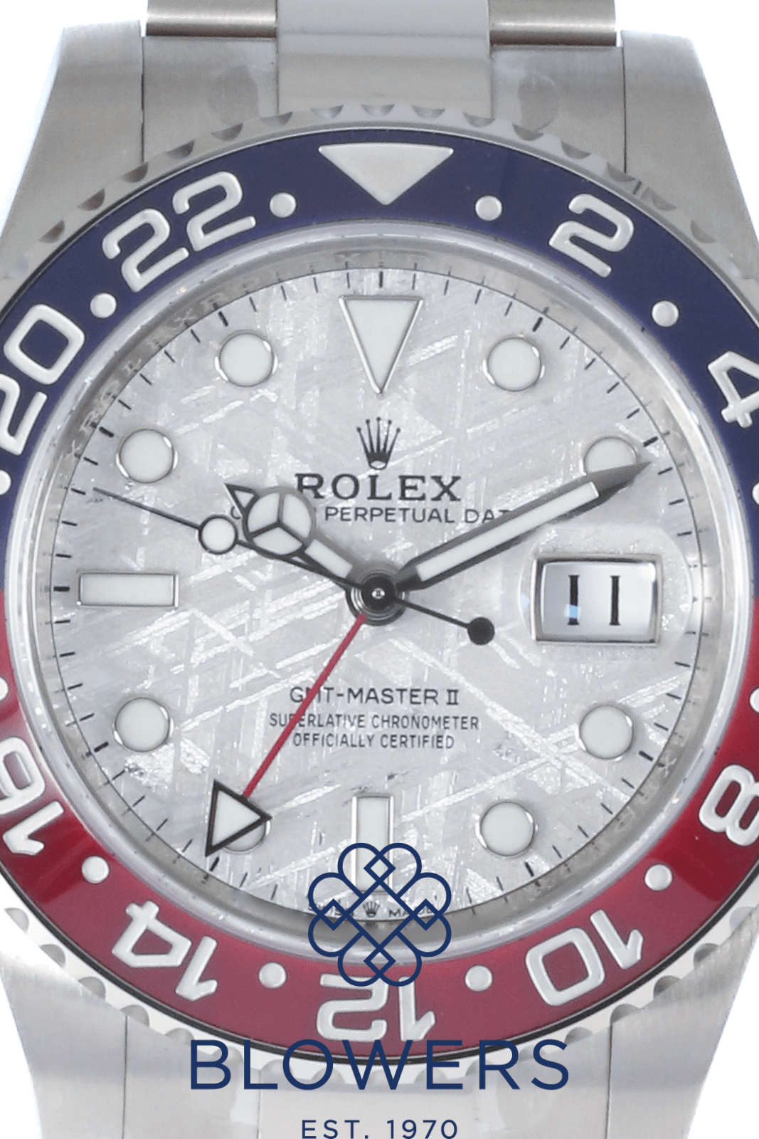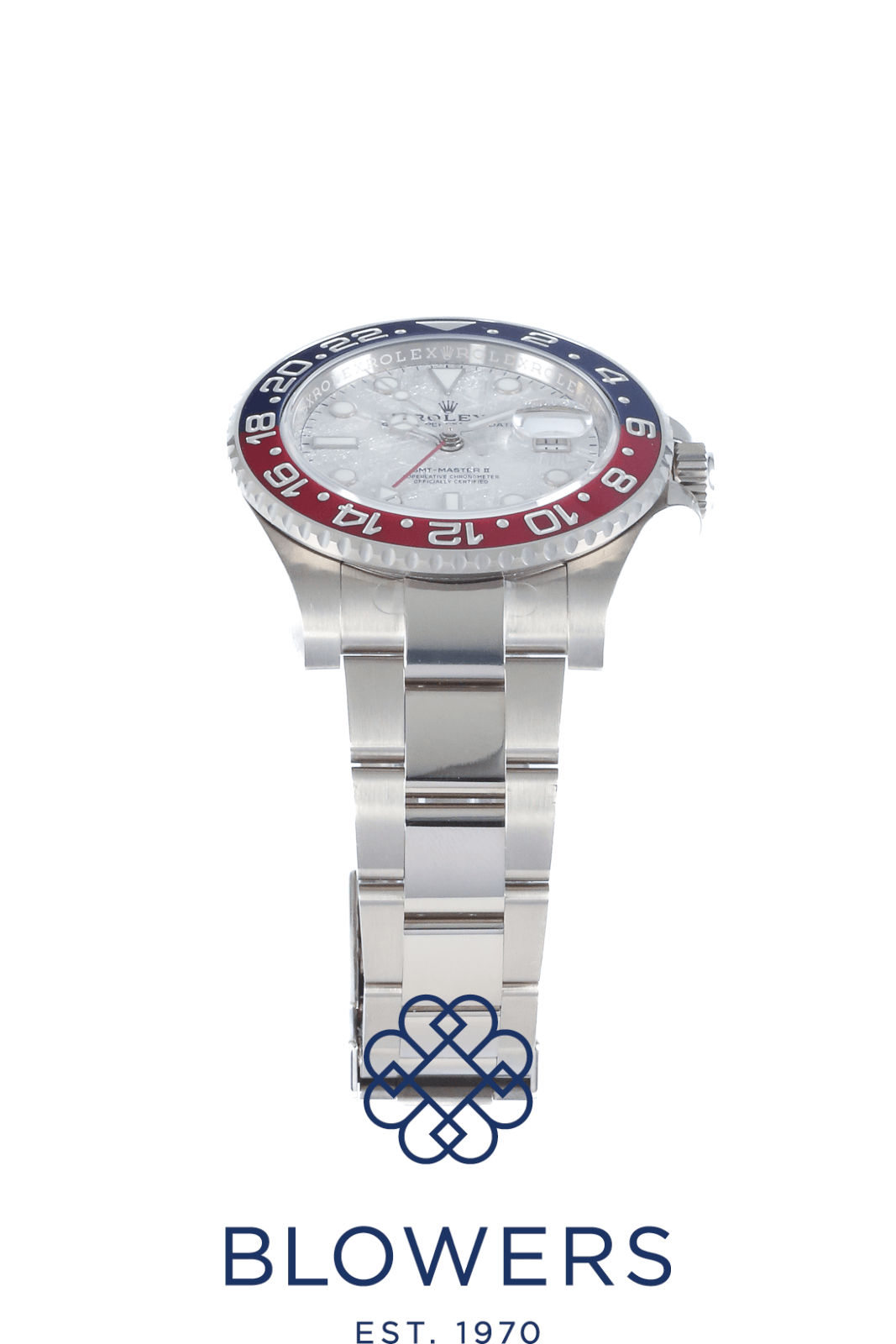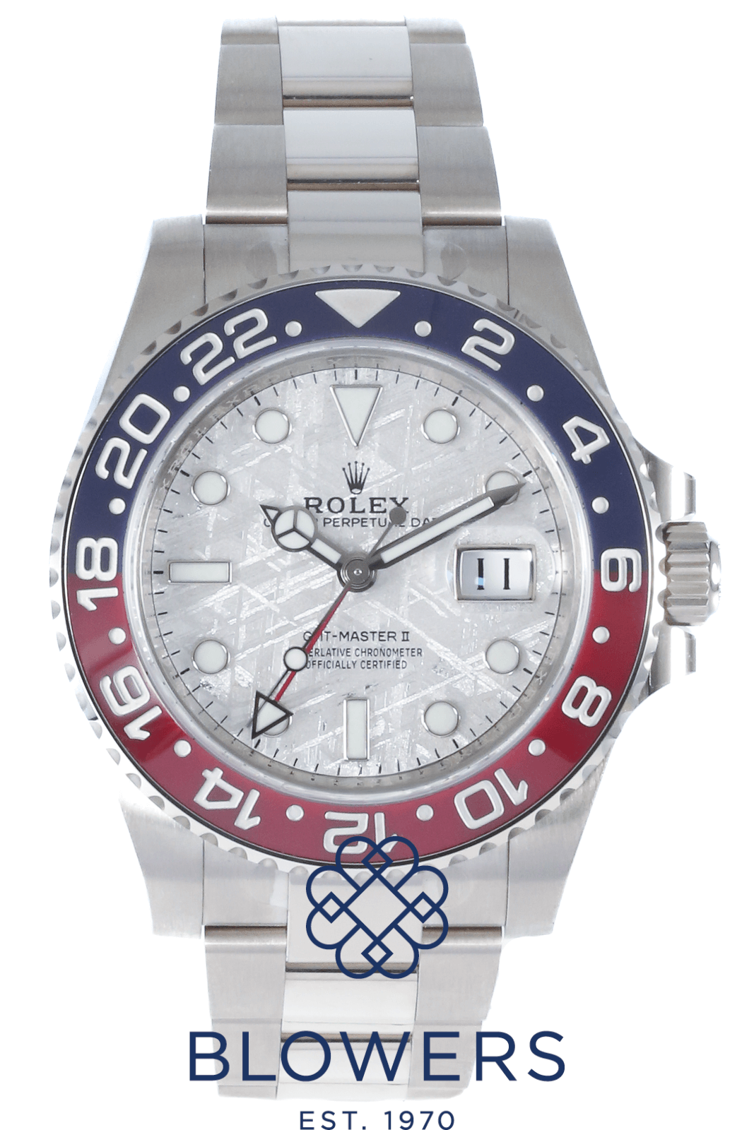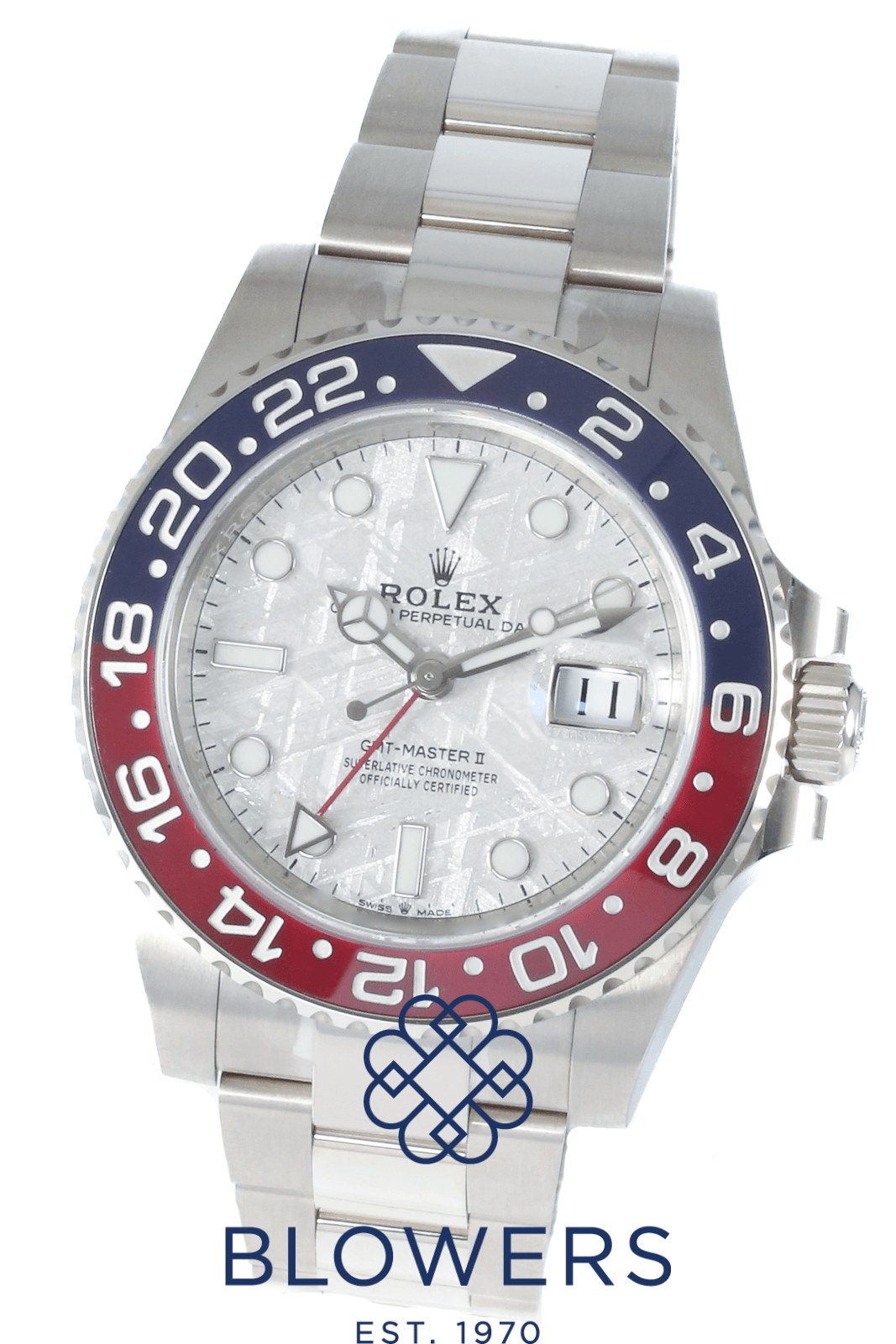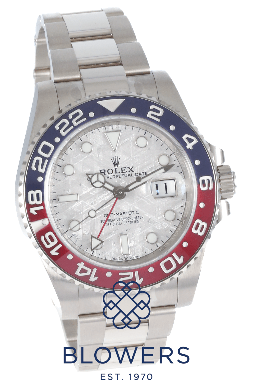 Rolex Oyster Perpetual GMT-Master II 126719BLRO. 18ct white gold 40mm diameter case with screw-down crown, water resistant up to 100 metres. Self-winding superlative chronometer calibre 3285 movement with a 70 hour power reserve. Bi-directional rotatable bezel fitted with a red and blue Cerachrom ceramic insert featuring engraved 24-hour graduations. Meteorite dial, luminescent hour markers and hands. Central hours, minutes and seconds hands with additional blue 24-hour GMT hand for tracking a second time zone. Sapphire crystal glass. Date window located at the 3 o’clock position with readability enhanced by the Cyclops lens. 18ct white gold Oyster bracelet with folding Oysterlock clasp and Easylink comfort extension. Box and papers dated June 2020.