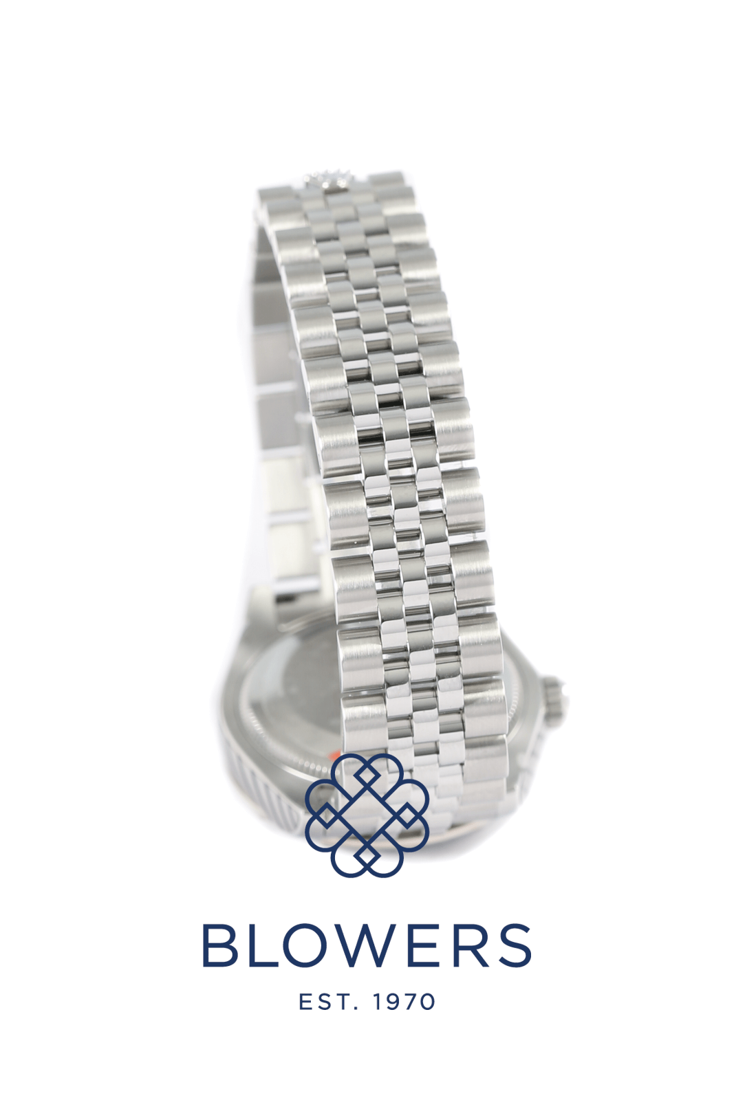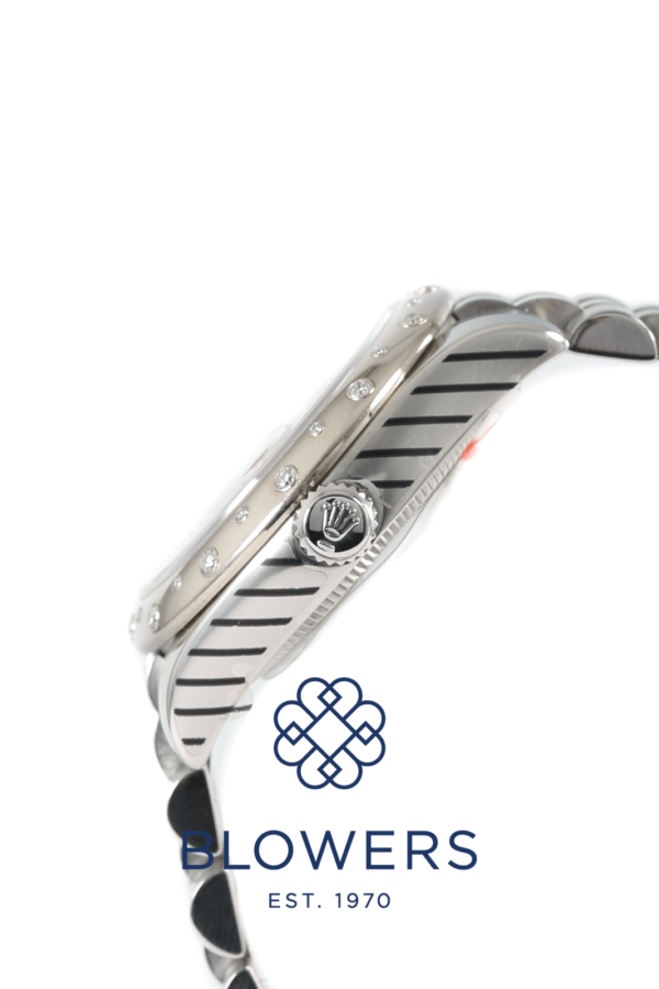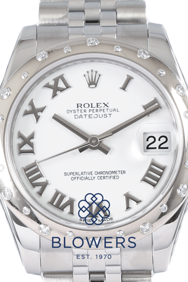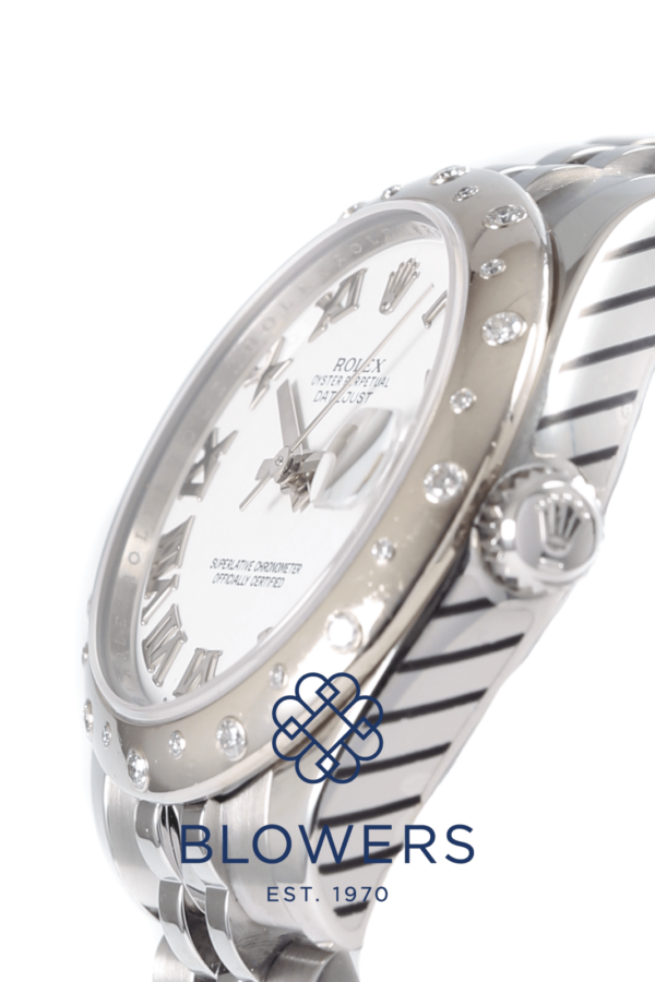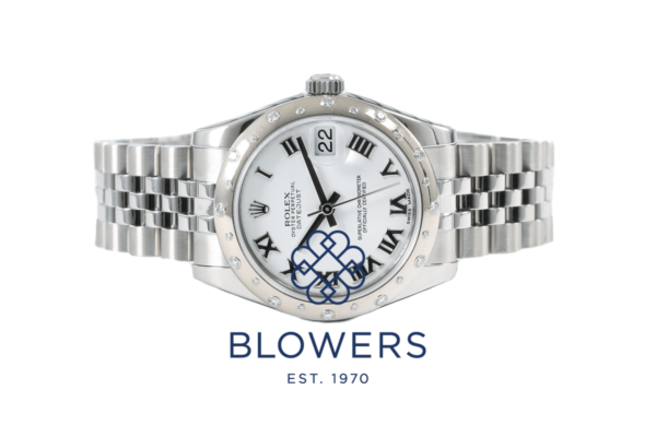 Rolex Oyster Perpetual  Datejust 178344. Featuring a 31mm Steel case with surrounded set in, scattered Diamonds on Bezel. Automatic movement. White dial with White Gold Roman numerals, Date window located at the 3 o’clock position. Water resistant to 100 metres. Comes on a Steel Jubilee Strap with a Steel concealed Clasp . Rolex box and papers dated August 2013. Rolex service papers dated May 2023.