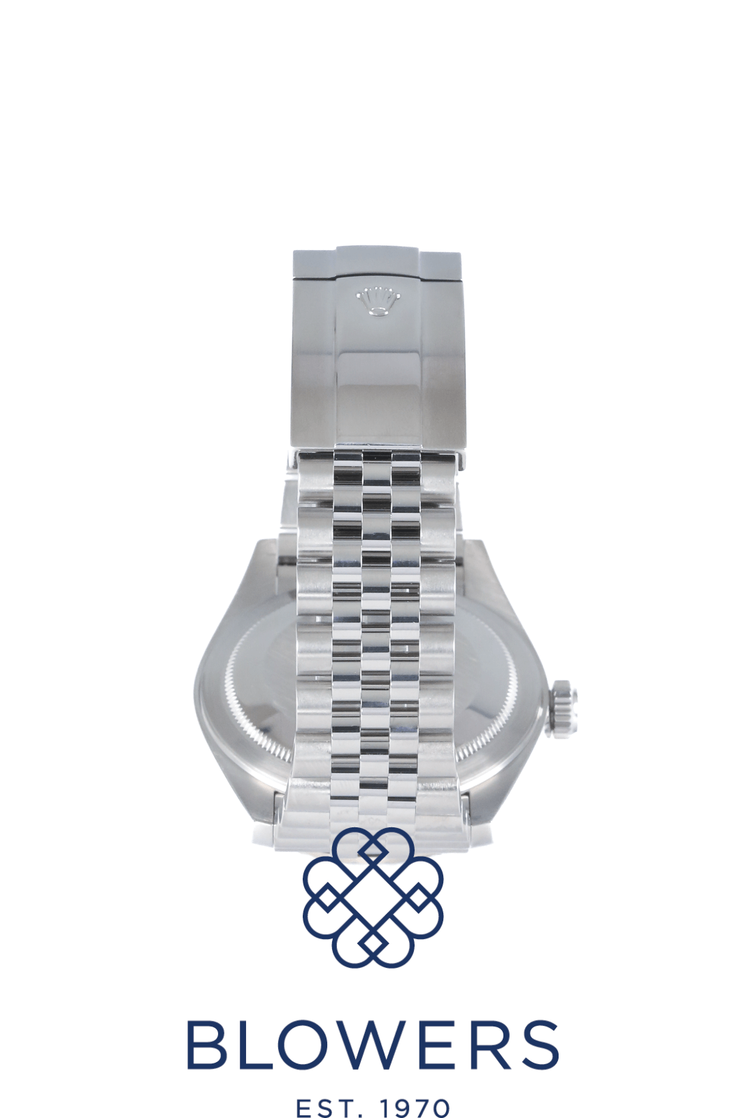 Striking bright-blue dial with index hour markers filled with luminescent Chromalight, 12 apertures around the edge of the dial to indicate the month, centre disk indicates 24 hour display and date at 3 o’clock with iconic cyclops lens. Functions: Saros system Annual Calendar, GMT, Month, date, hours, minutes, seconds. Oystersteel brushed and polished jubilee bracelet with Easylink rapid-extension system giving 5mm adjustment.