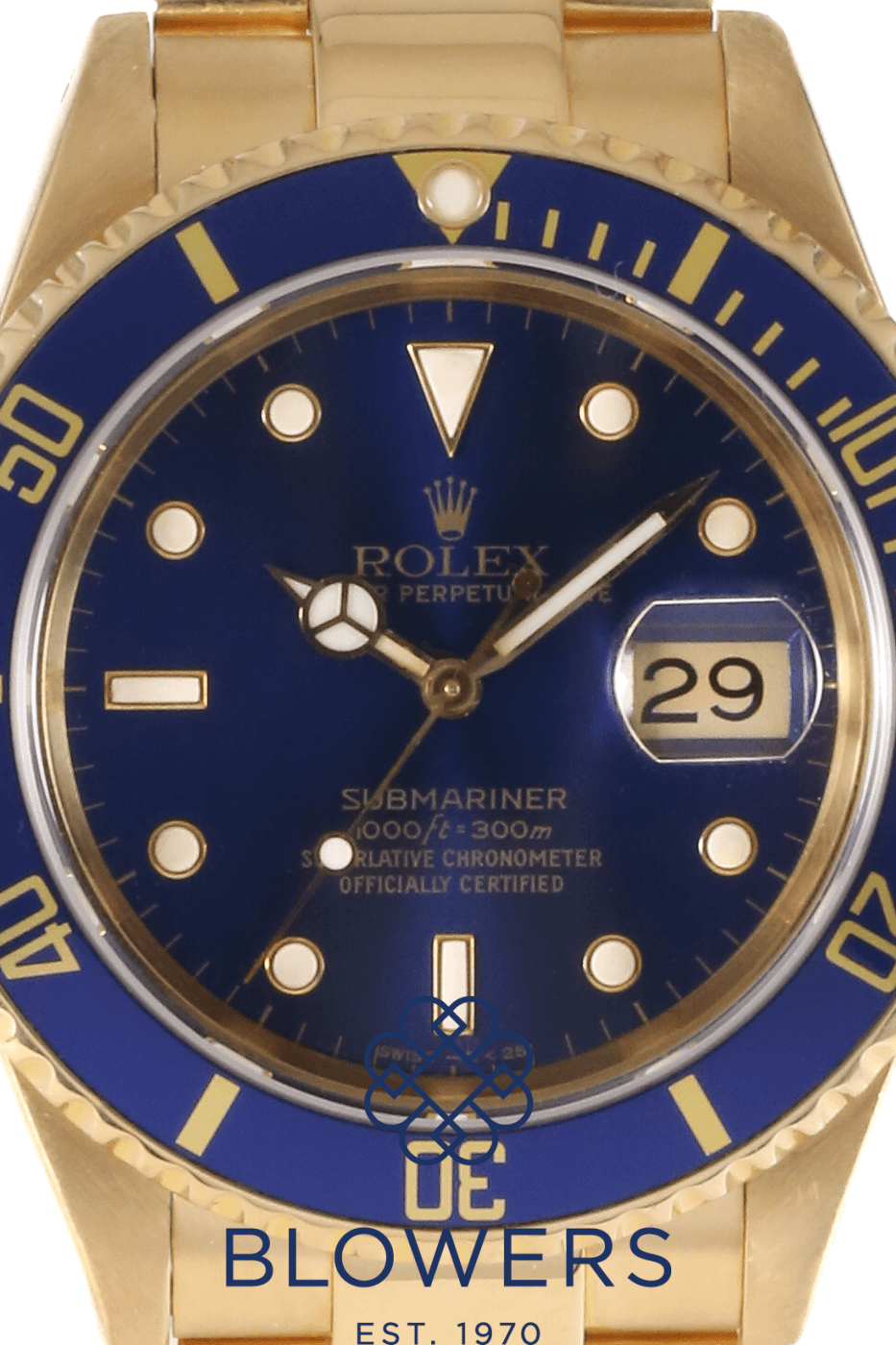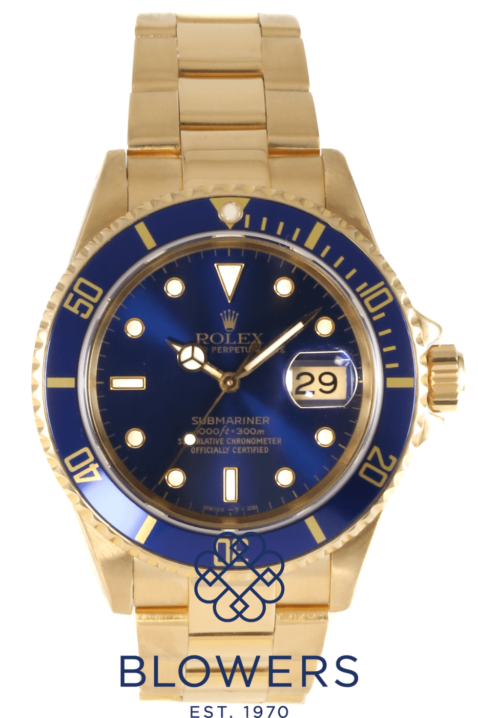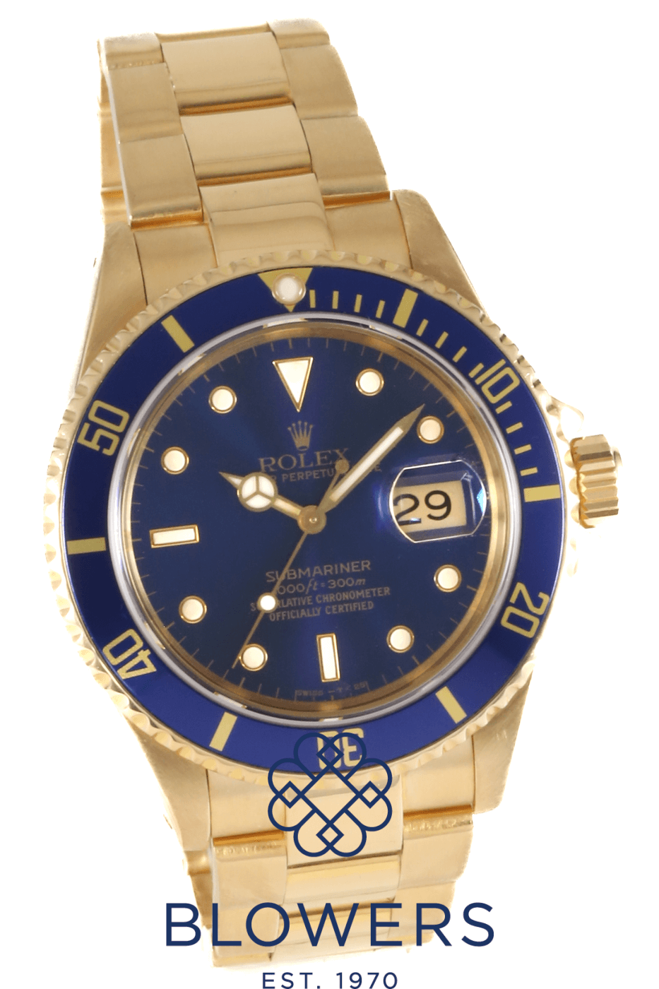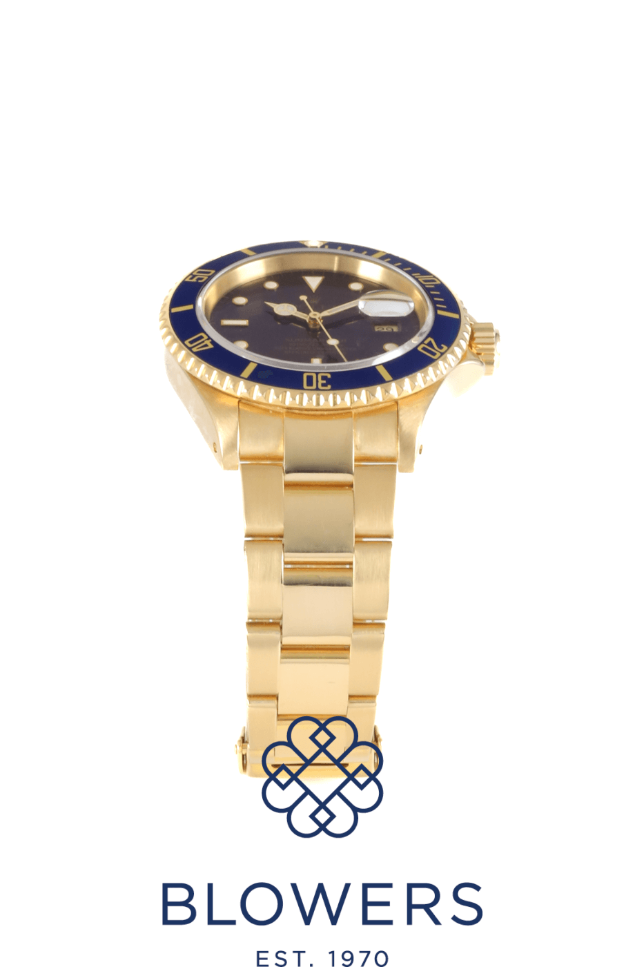 Rolex Oyster Perpetual Submariner Date 16618. 40mm diameter 18ct yellow gold case which is water resistant to 300 meters. Automatic self-winding calibre 3135 movement of 31 jewels. A power reserve of 50 hours. Blue dial with luminous index hour markers and hands outlined in yellow gold. Central hours, minutes and seconds hands. A cyclops lens date window at the three o’clock position. Uni-directional rotating bezel in yellow gold with a sixty minute graduated blue aluminium insert. Scratch resistant sapphire crystal glass. 18ct yellow gold Oyster bracelet with a folding oysterlock clasp and the wetsuit extension system. Box and papers dated 2001. Rolex accredited service in 2016.  Rolex service Papers dated February 2026 providing a 24 month warranty.