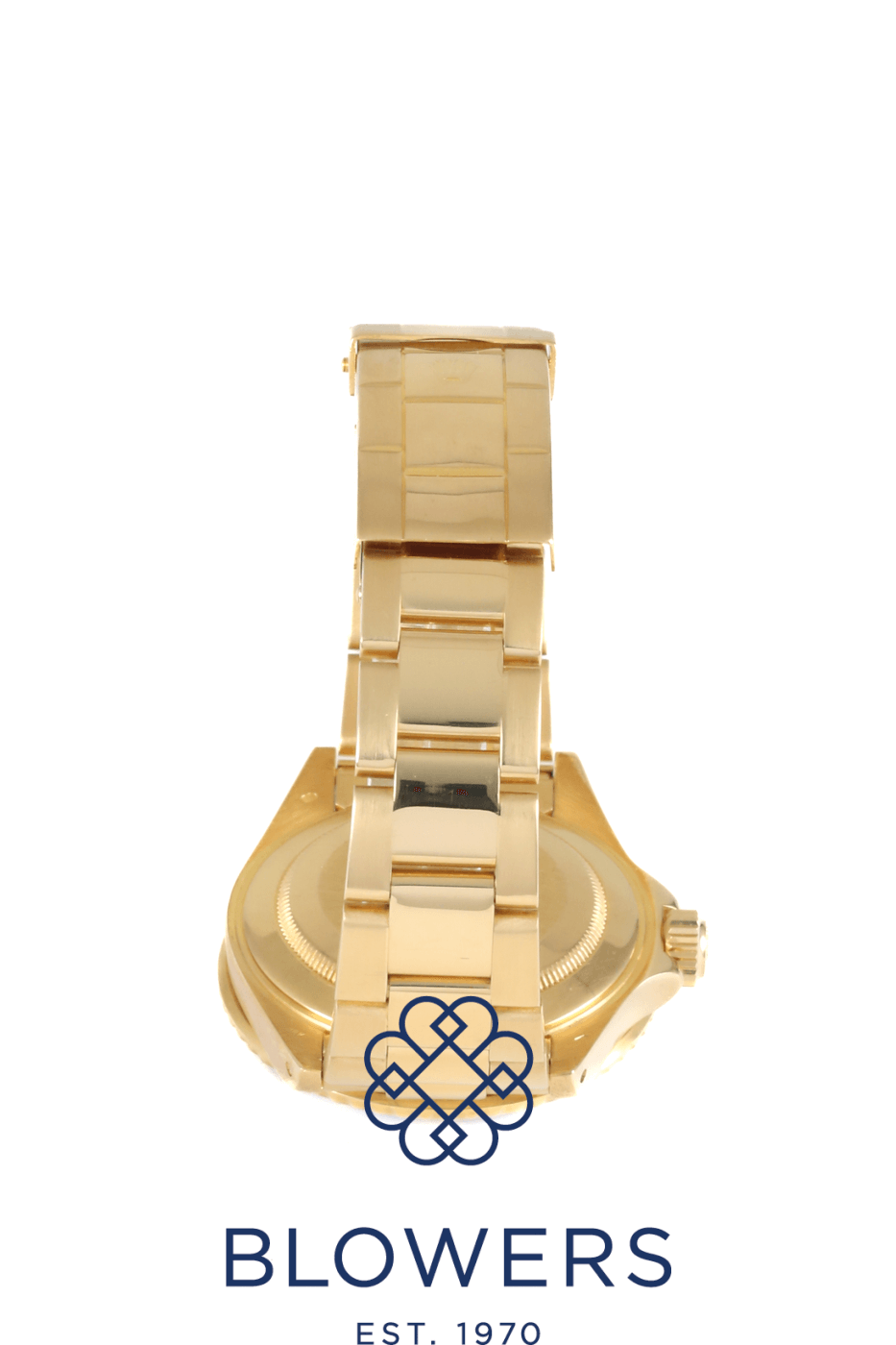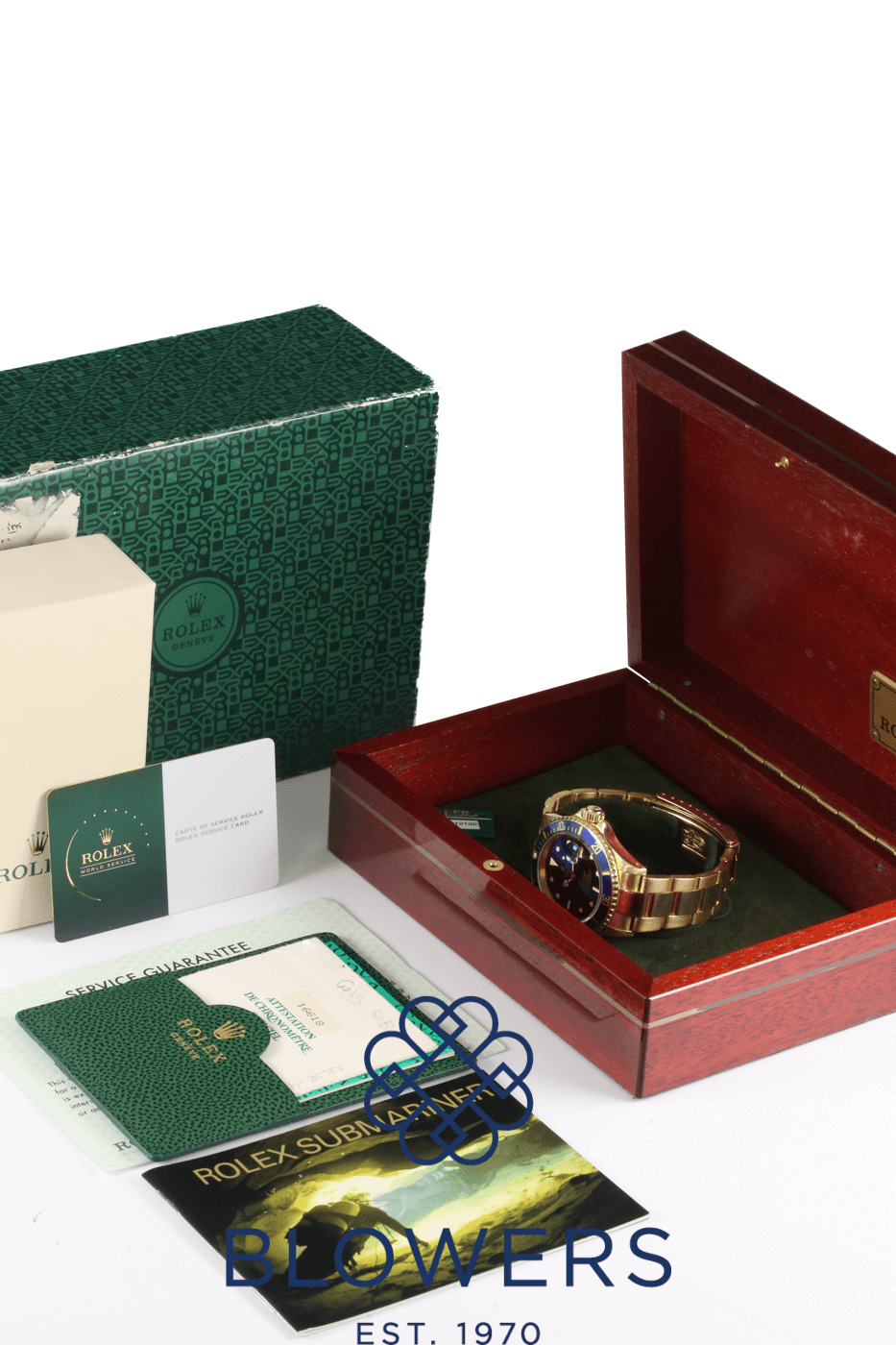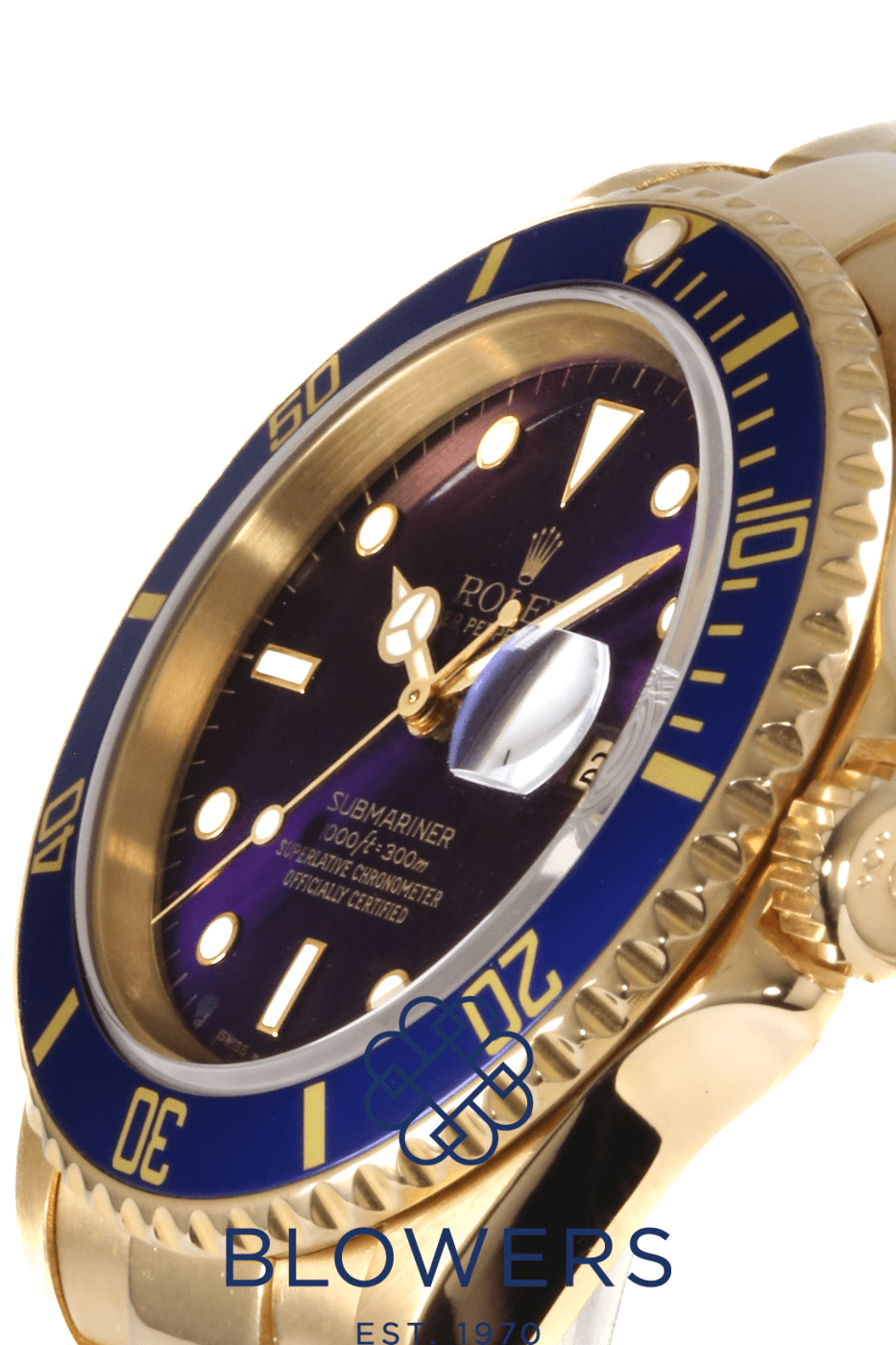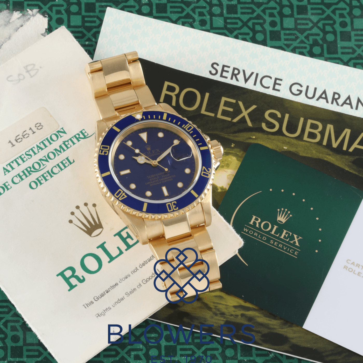 Rolex Oyster Perpetual Submariner Date 16618. 40mm diameter 18ct yellow gold case which is water resistant to 300 meters. Automatic self-winding calibre 3135 movement of 31 jewels. A power reserve of 50 hours. Blue dial with luminous index hour markers and hands outlined in yellow gold. Central hours, minutes and seconds hands. A cyclops lens date window at the three o’clock position. Uni-directional rotating bezel in yellow gold with a sixty minute graduated blue aluminium insert. Scratch resistant sapphire crystal glass. 18ct yellow gold Oyster bracelet with a folding oysterlock clasp and the wetsuit extension system. Box and papers dated 2001. Rolex accredited service in 2016.  Rolex service Papers dated February 2026 providing a 24 month warranty.
