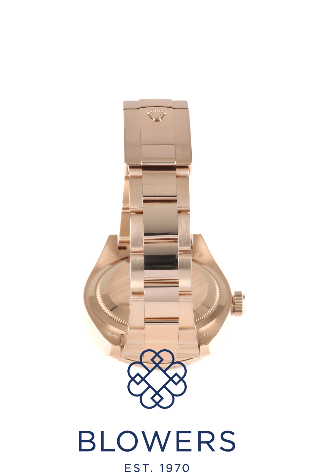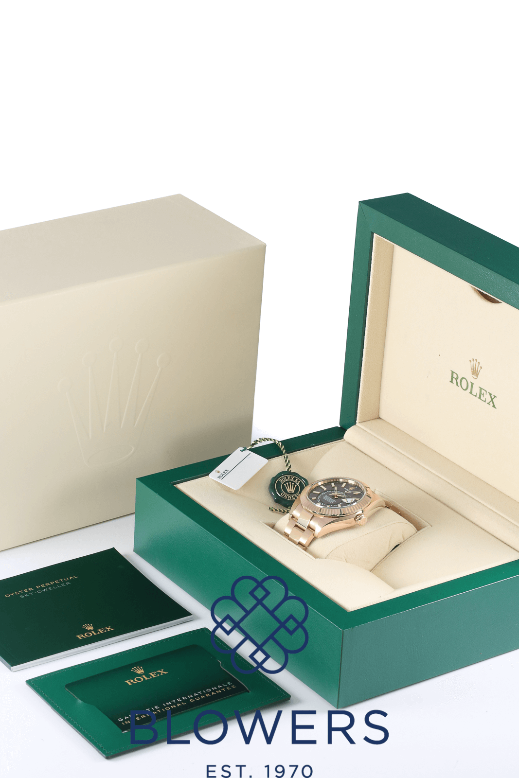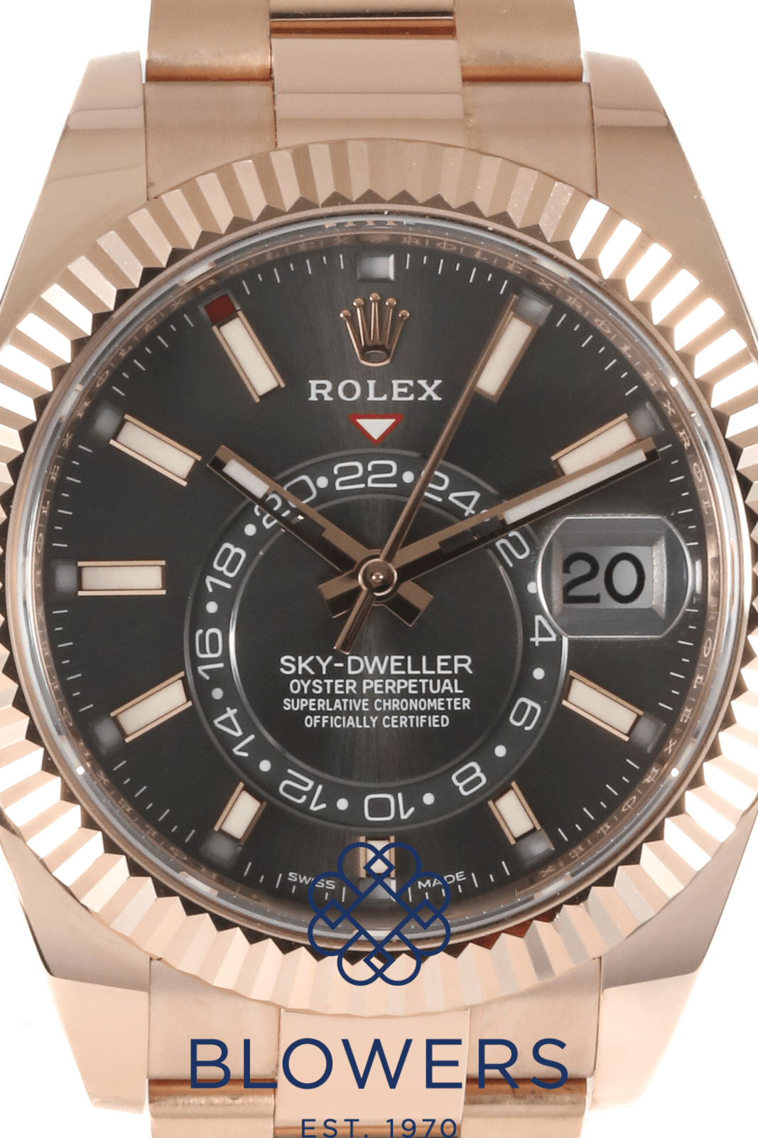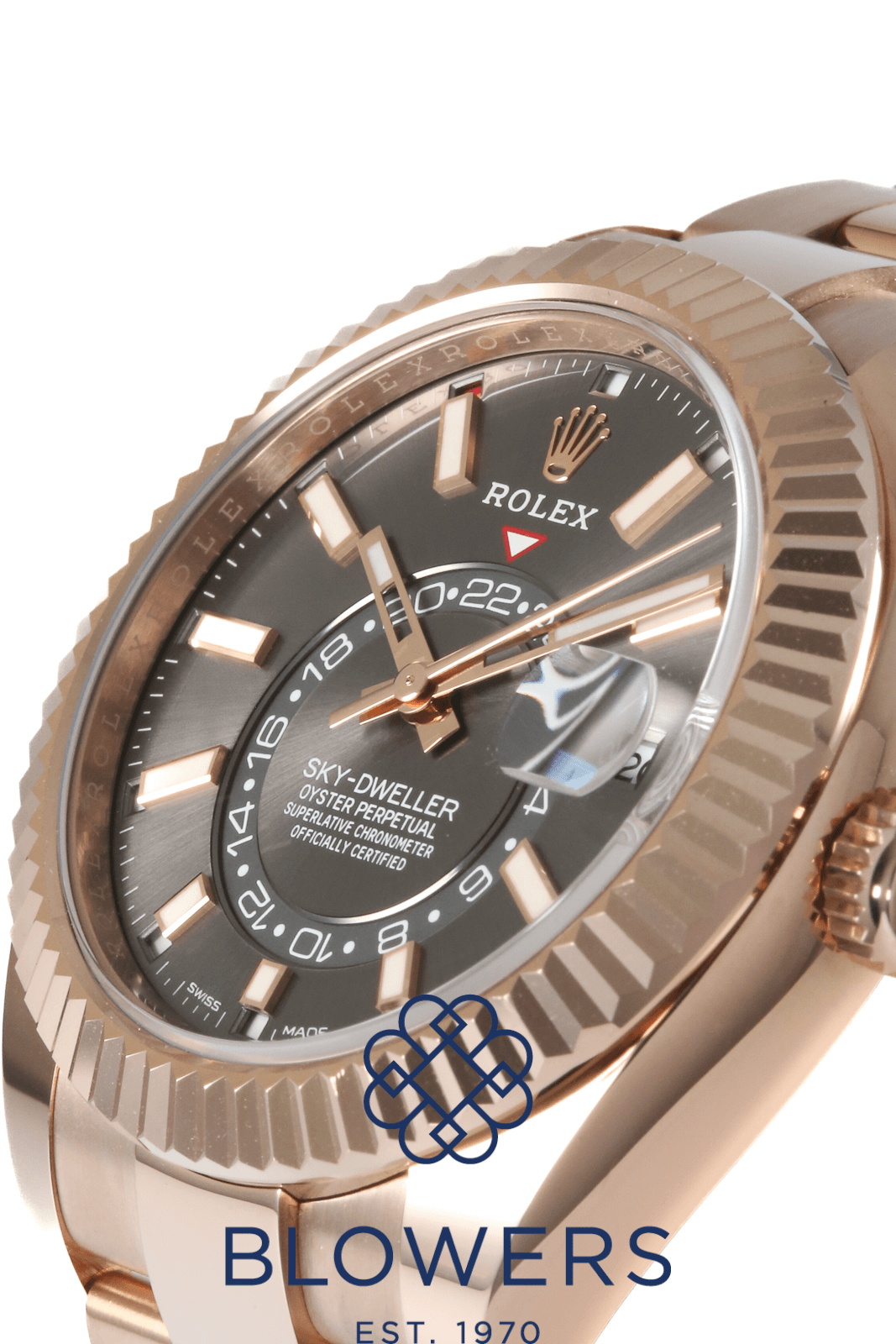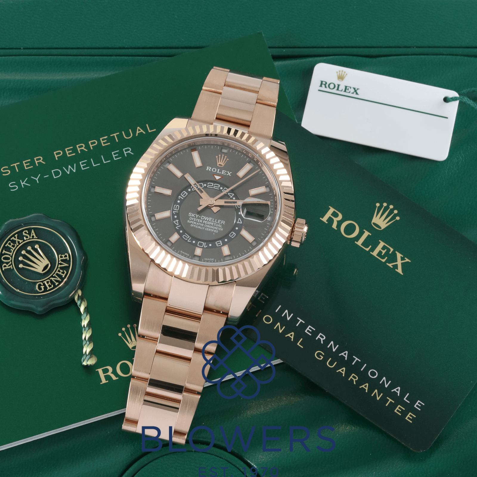 Rolex Oyster Perpetual Sky-Dweller 326935. 42mm diameter, 18ct rose gold case. Water resistant to 100m / 330ft. Automatic chronometer Rolex 9001 calibre movement. Dark rhodium dial with index hour markers, 12 apertures around the edge of the dial to indicate the month, centre disk indicates 24 hour display and date at the 3 o’clock position. Fluted bi-directional ring command Bezel. 18ct rose gold oyster lock bracelet. Box and papers dated April 2024.
