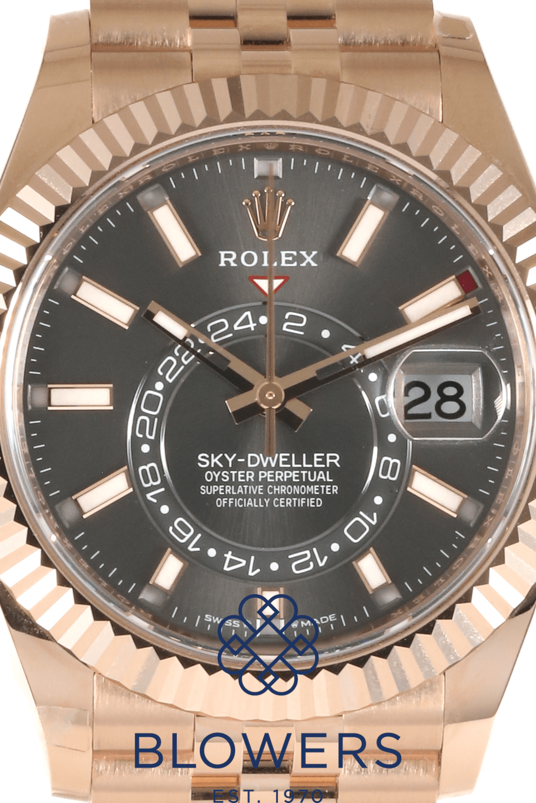Rolex Sky-Dweller 336935. 18ct Everose gold 42mm case with screw-down crown, water resistant up to 100 metres. Self-winding superlative chronometer calibre 9002 movement with dual time zones and annual calendar, providing a 72-hour power reserve. Fluted Everose gold bezel with Ring-Command system for easy function setting. “Rhodium” Slate grey sunburst dial with off-centre 24-hour disc for second time zone, month display in 12 windows around the dial, and date window at the 3 o’clock position. Central hour, minute, and seconds hands. Scratch-resistant sapphire crystal with Cyclops lens over the date. 18ct Everose gold Jubilee bracelet with folding Oysterclasp and 5mm Easylink comfort extension link. Box and papers dated February 2025.
