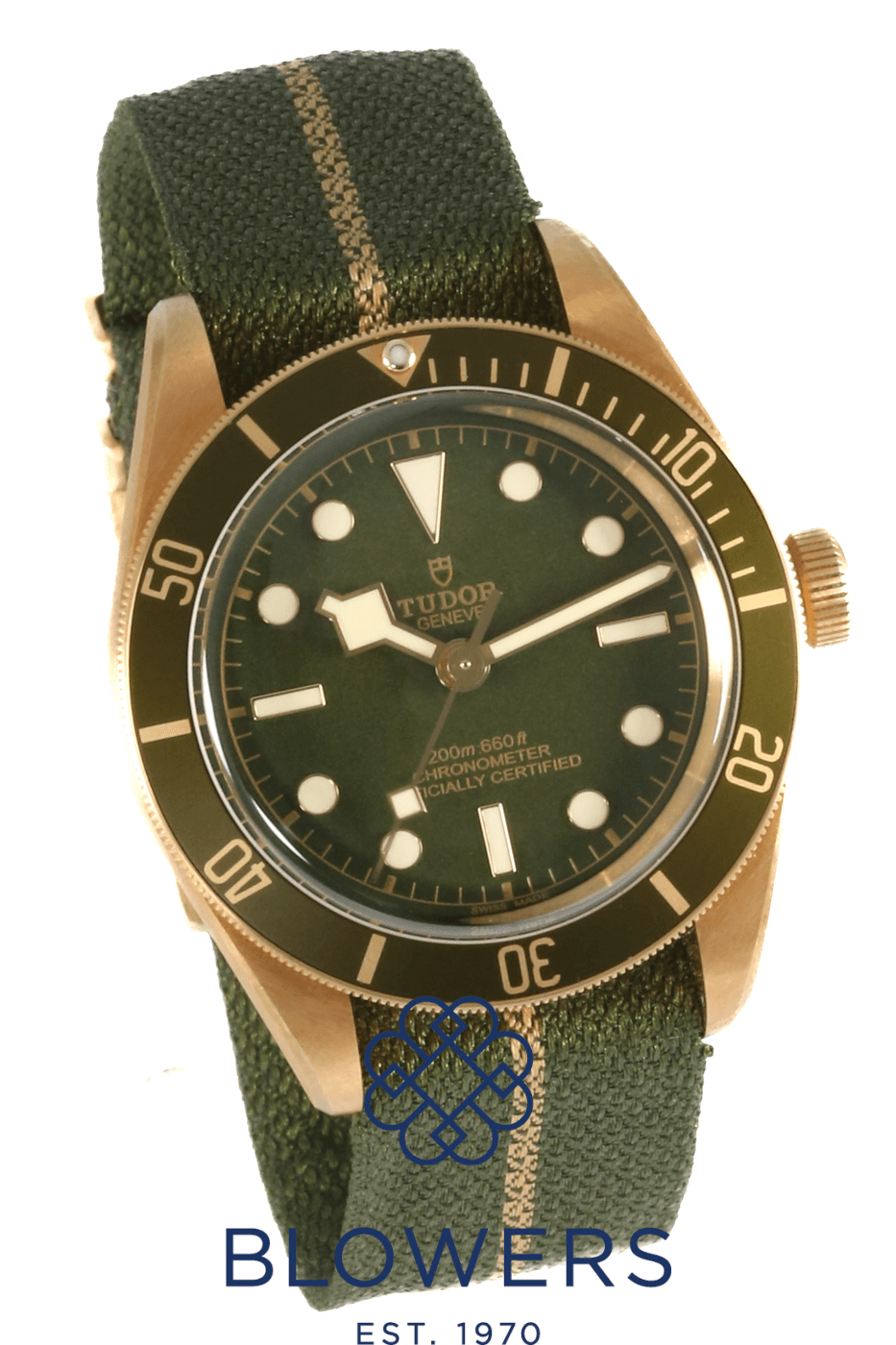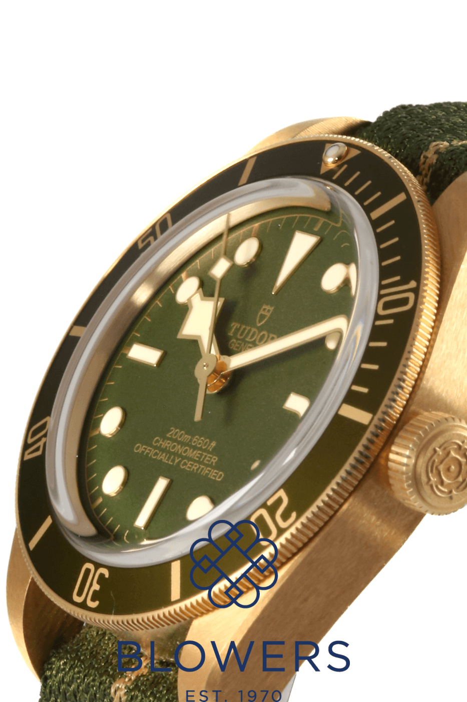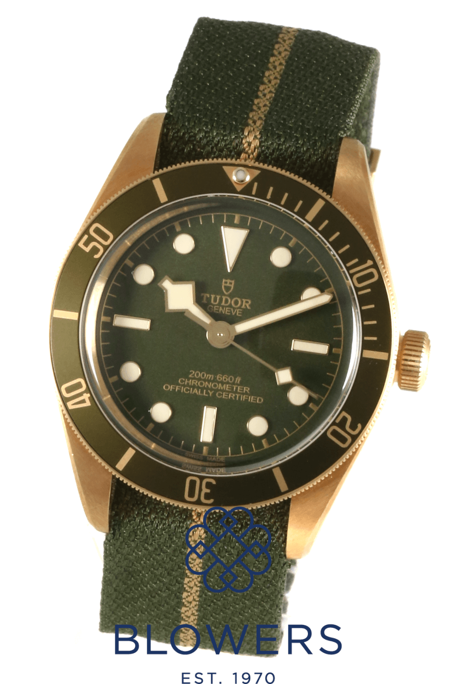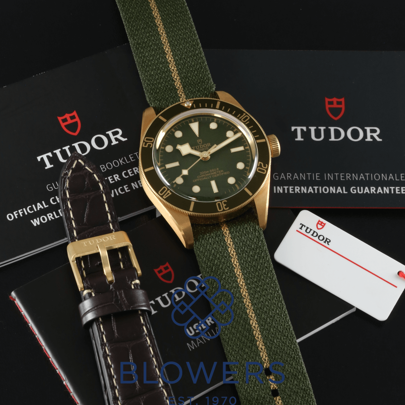 Tudor Black Bay 58 18K M79018V-0001. 18ct yellow gold 39mm diameter case with screw-down crown, water resistant up to 200 metres. Self-winding manufacture calibre MT5400 chronometer-certified movement, with a 70 hour power reserve. Uni-directional rotating bezel in 18ct yellow gold with matt green anodised aluminium insert and 60 minute graduation. Domed matt green dial with applied gold hour markers and luminescent hands. Central hours, minutes and seconds hands. Sapphire crystal glass. Brown alligator leather strap with 18ct yellow gold pin buckle. Additional Tudor green and gold nato strap with 18ct yellow gold pin buckle. Box and papers dated December 2021.