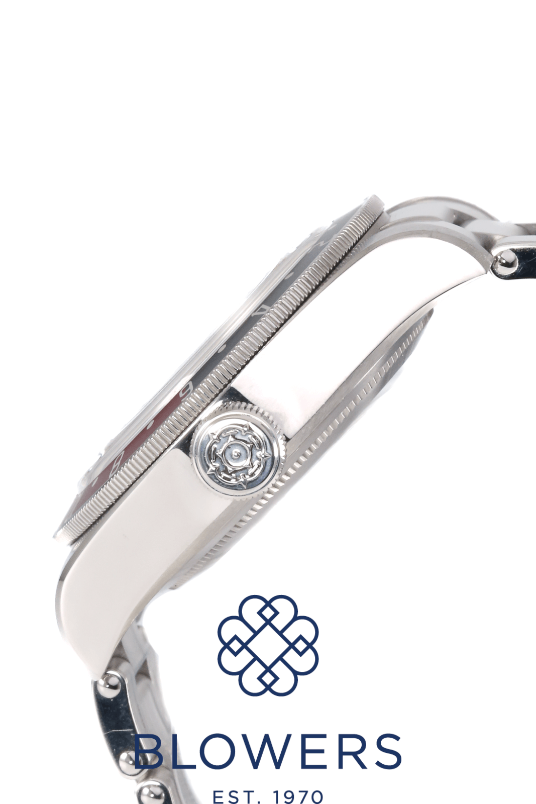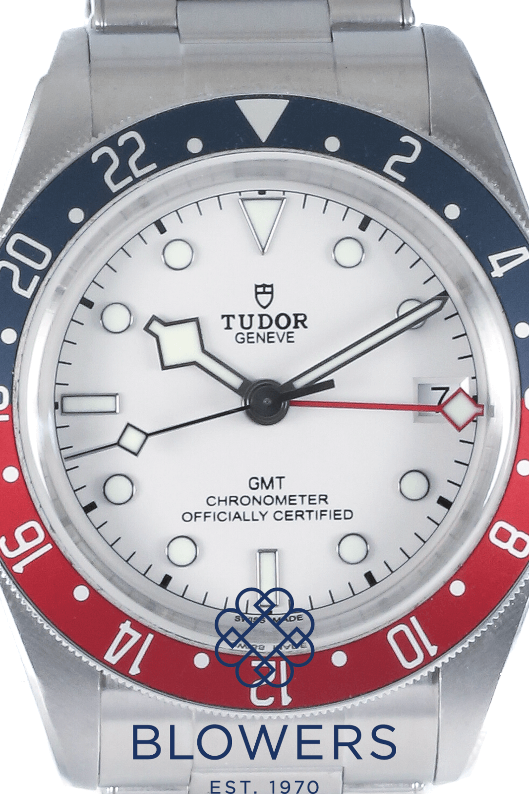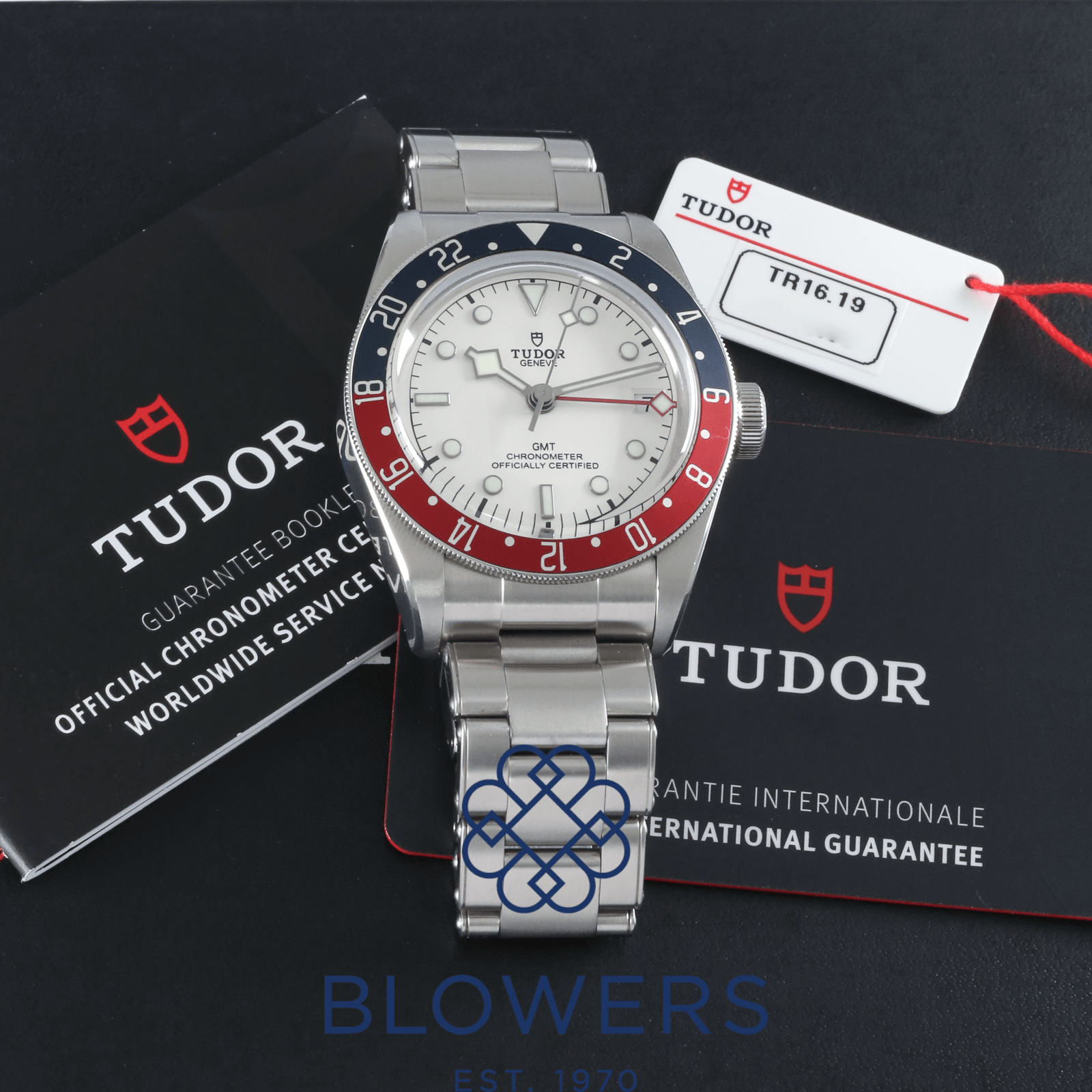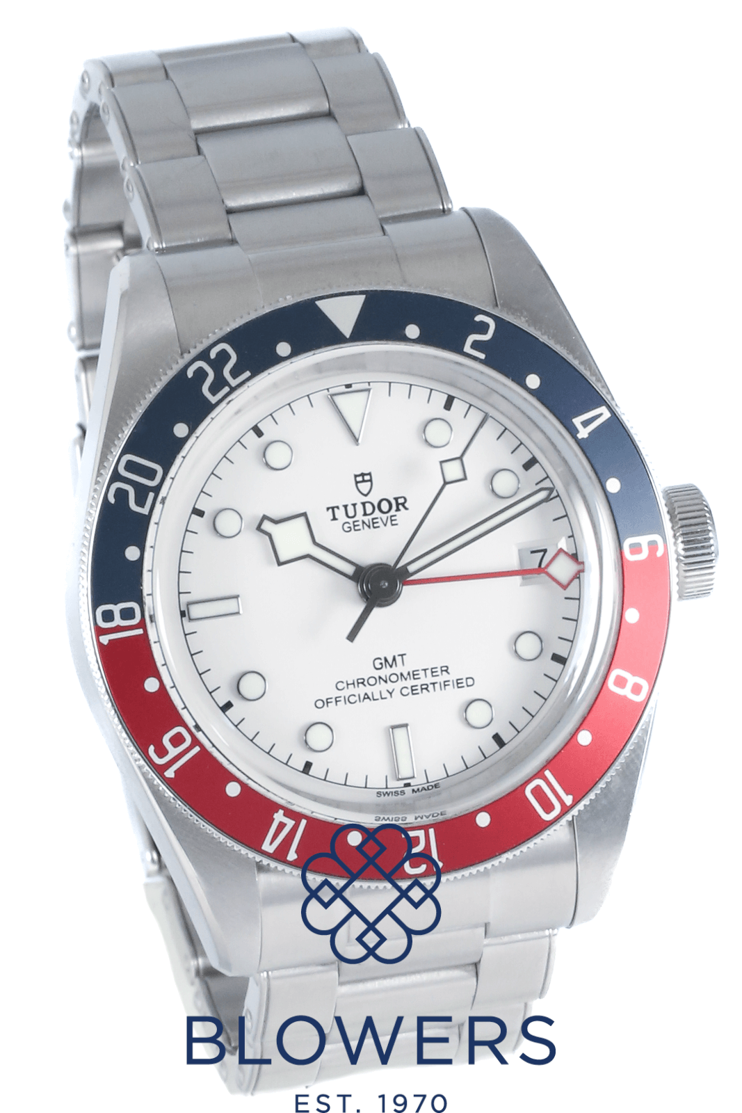 Tudor Black Bay GMT 79830RB. 41mm stainless steel casing, housing an automatic, self-winding calibre MT5652 movement. Water resistant to 200 meters. A power reserve of 70 hours. Featuring an opaline dial, with luminous index hour markers. Bi-directional blue and red bezel with 24 hour graduation. With central, luminous “snowflake” hours, minutes and seconds hands. Red luminous hand for GMT function. Scratch resistant sapphire crystal glass. Upon a steel rivet bracelet, with a folding clasp. Box and papers dated December 2023.