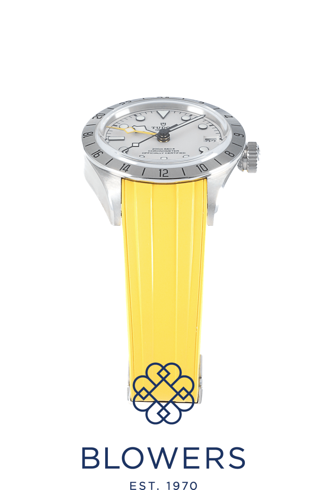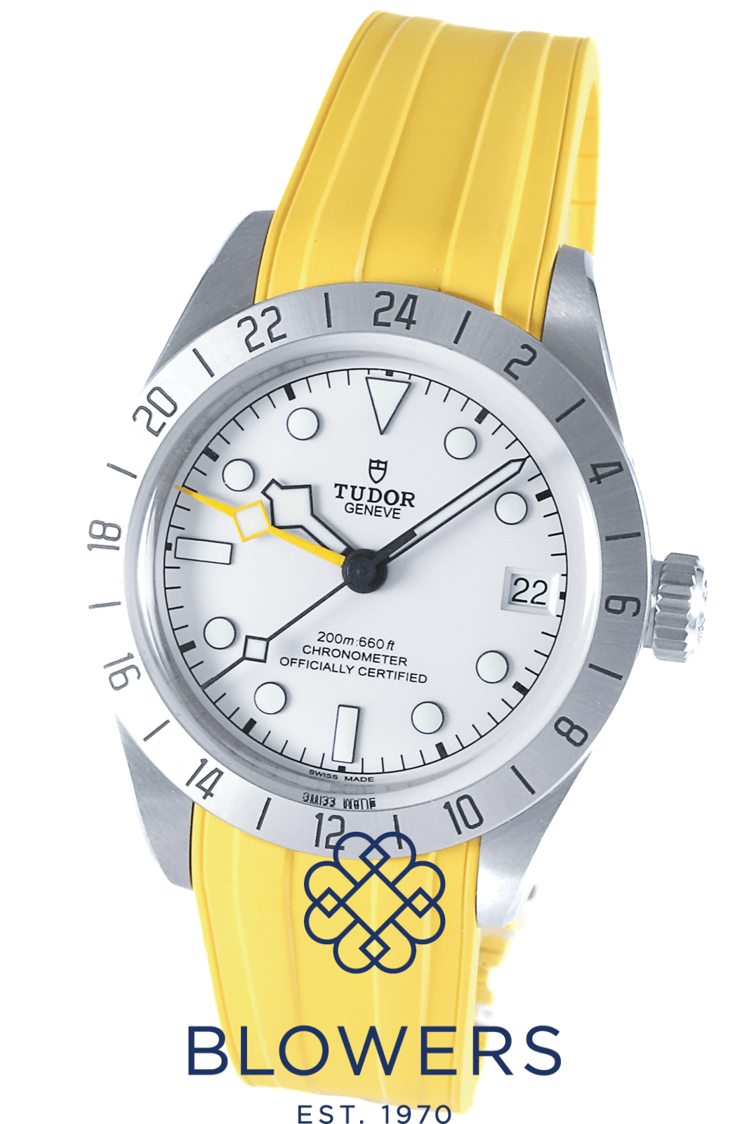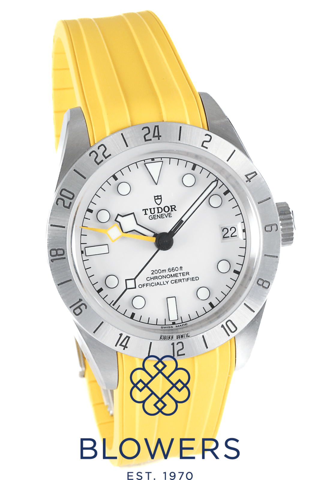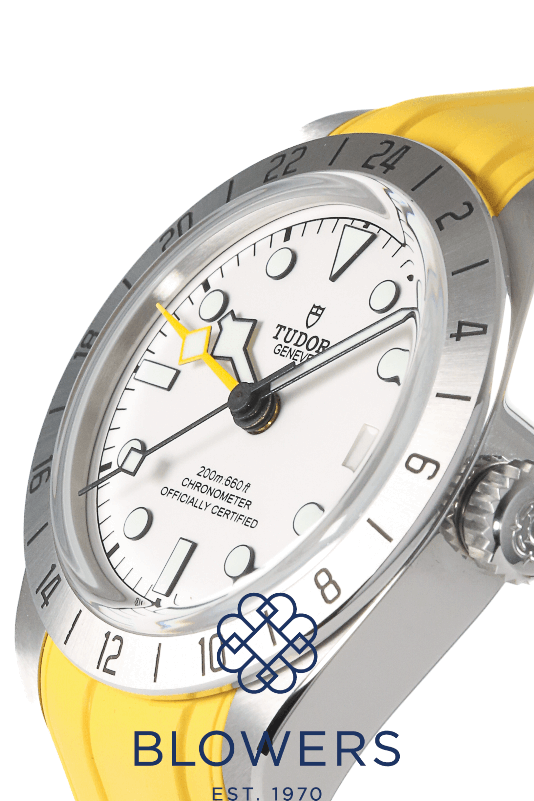 Tudor Black Bay Pro GMT 79470. 39mm steel casing with a screw down crown, and a water resistance of up to 200 meters. Self-winding mechanical MT5652 automatic movement, with a power reserve of approximately 70 hours. Steel, graduated 24 hour bezel, with black Arabic numerals. Matte off white dial, with luminous hour markers. Luminous hours, minutes and seconds hand. Yellow luminous hand for second time zone function. Date function at the 3 o’clock position. Tudor steel strap, with folding clasp. Additional yellow rubber strap with spring action butterfly clasp. Box and papers dated December 2025.