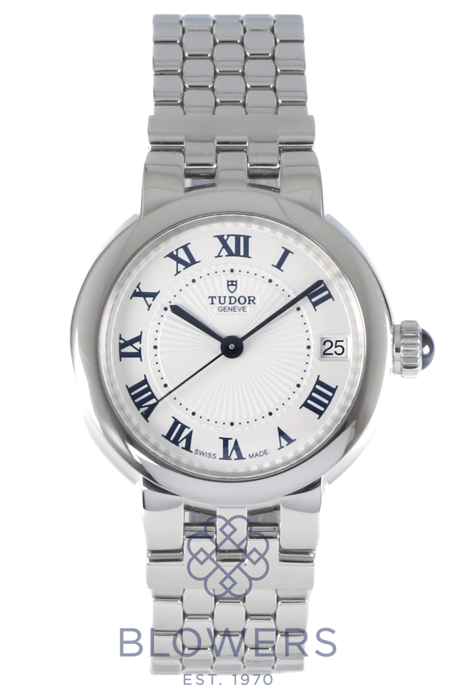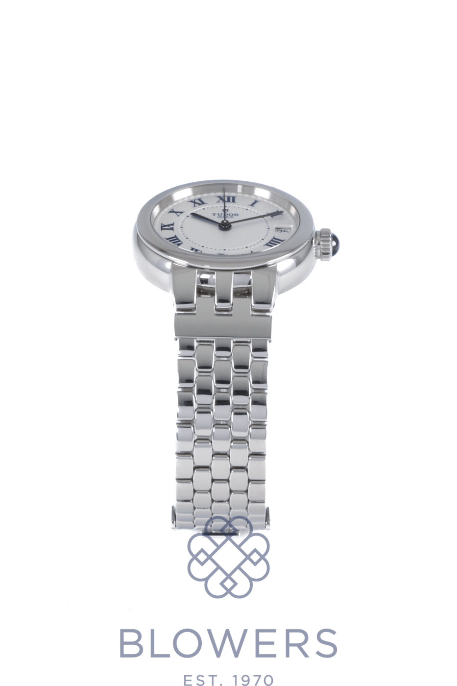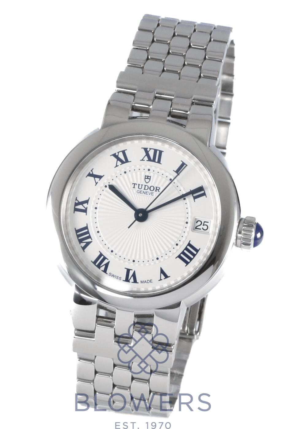 Tudor Clair de Rose 35800. Stainless steel 34mm diameter case with screw-down crown set with a blue cabochon, water resistant up to 100 metres. Self-winding calibre T201 automatic movement with an approximate 38-hour power reserve. Smooth polished stainless steel bezel. Opaline dial with blue Roman numerals and embossed decoration, complemented by blued steel hands. Central hours, minutes and seconds hands. Sapphire crystal glass. Date window located at the 3 o’clock position. Stainless steel bracelet with folding clasp. Box and papers dated October 2017.