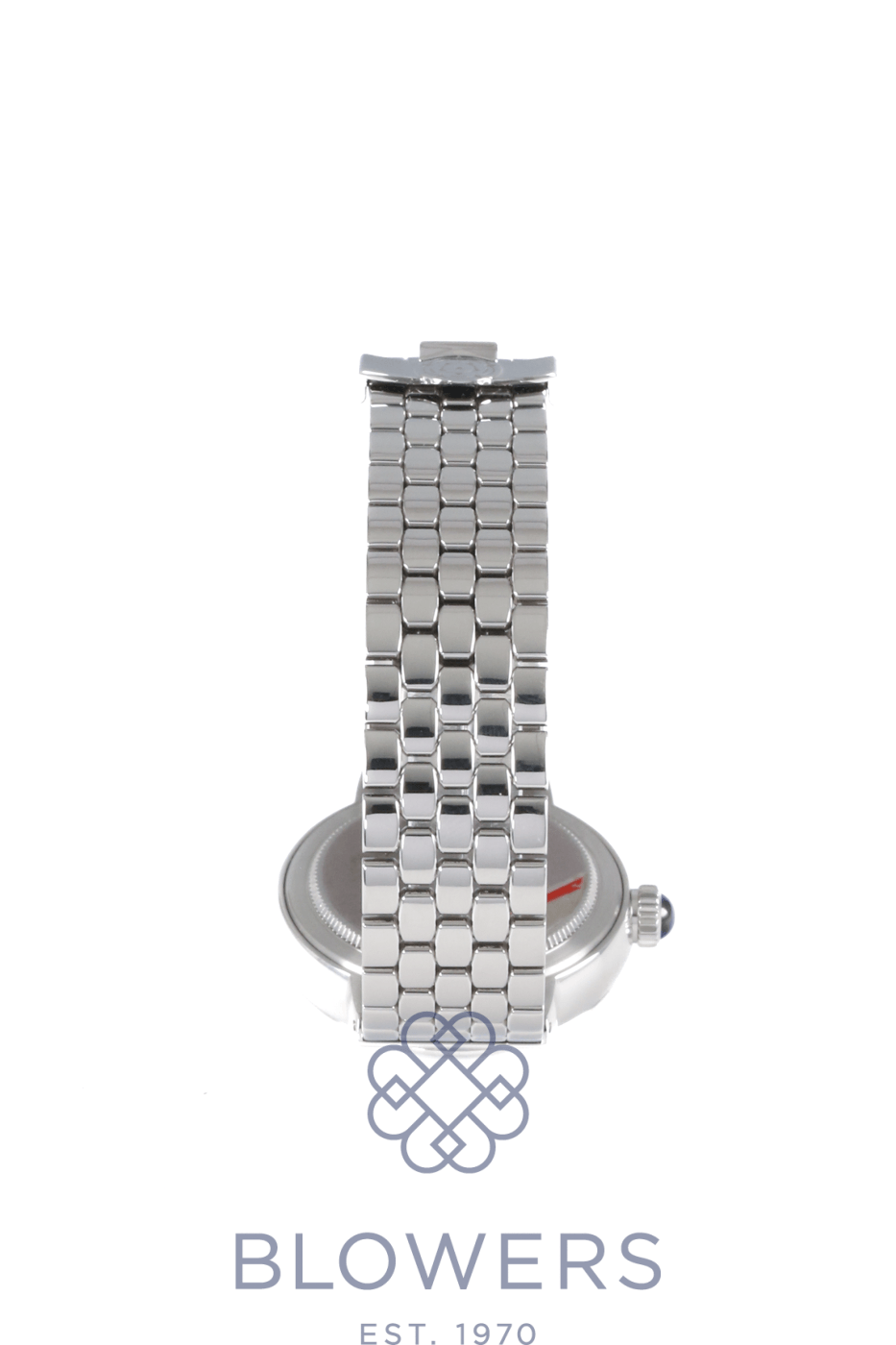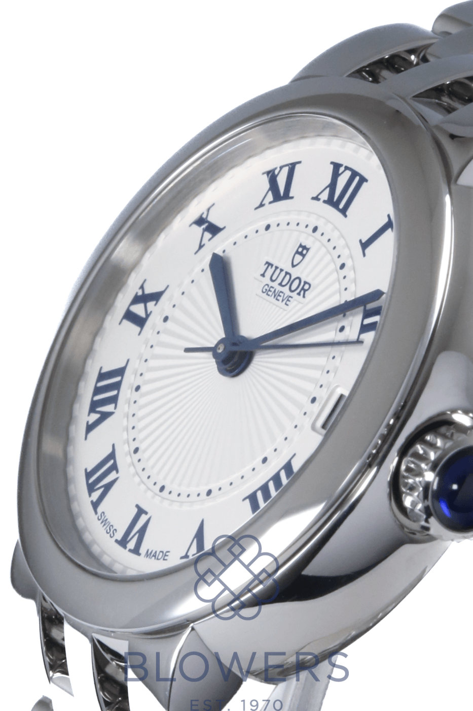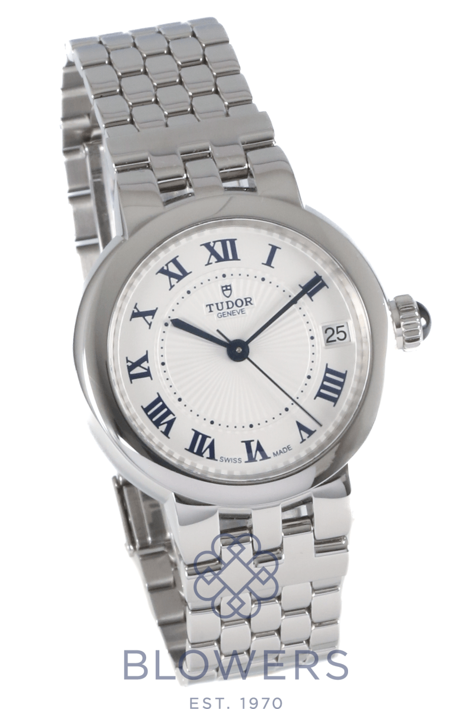 Tudor Clair de Rose 35800. Stainless steel 34mm diameter case with screw-down crown set with a blue cabochon, water resistant up to 100 metres. Self-winding calibre T201 automatic movement with an approximate 38-hour power reserve. Smooth polished stainless steel bezel. Opaline dial with blue Roman numerals and embossed decoration, complemented by blued steel hands. Central hours, minutes and seconds hands. Sapphire crystal glass. Date window located at the 3 o’clock position. Stainless steel bracelet with folding clasp. Box and papers dated October 2017.