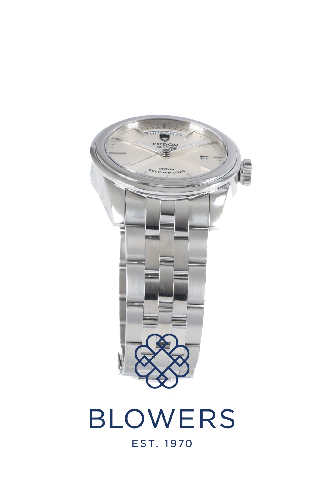 Tudor Glamour Day Date 56000. Steel case, 39mm in diameter. Self-winding mechanical movement. This watch is water resistant to 100 meters. Silver dial with baton hours markers. Date display at the 3 o’clock position and Day display at the 12 o’clock position. Steel bracelet with a steel folding clasp. Box and Papers dated November 2019.