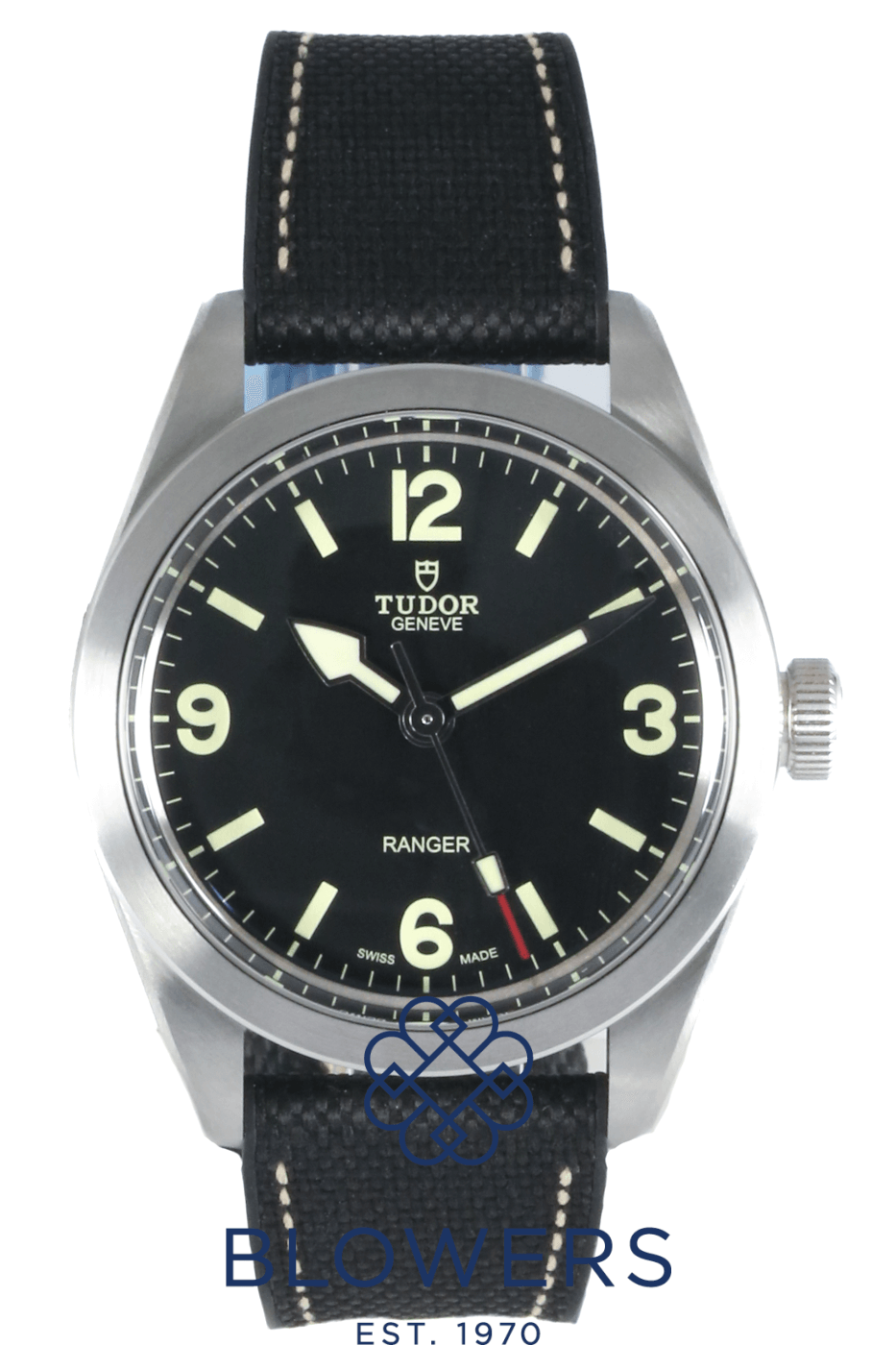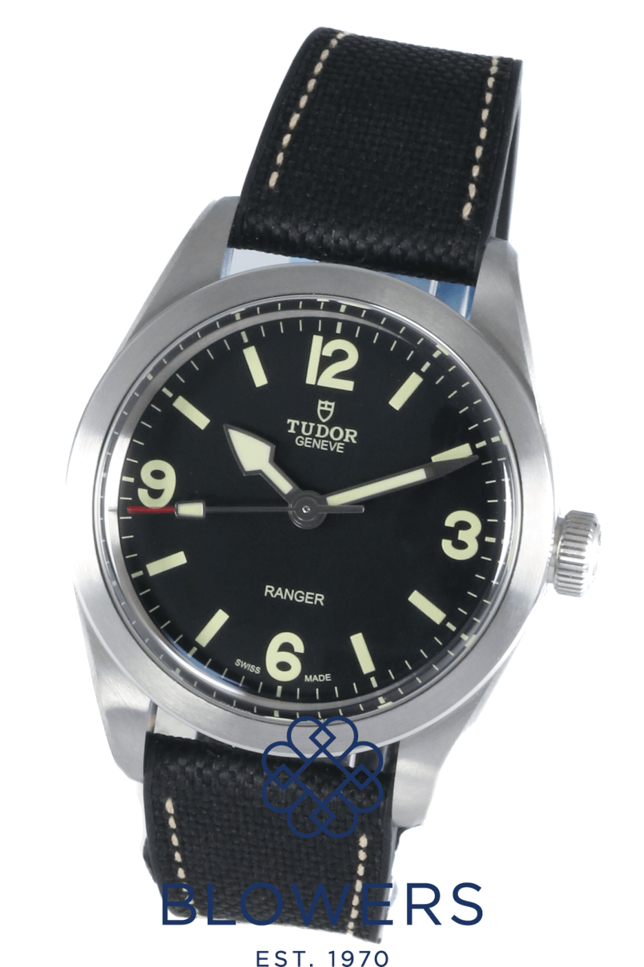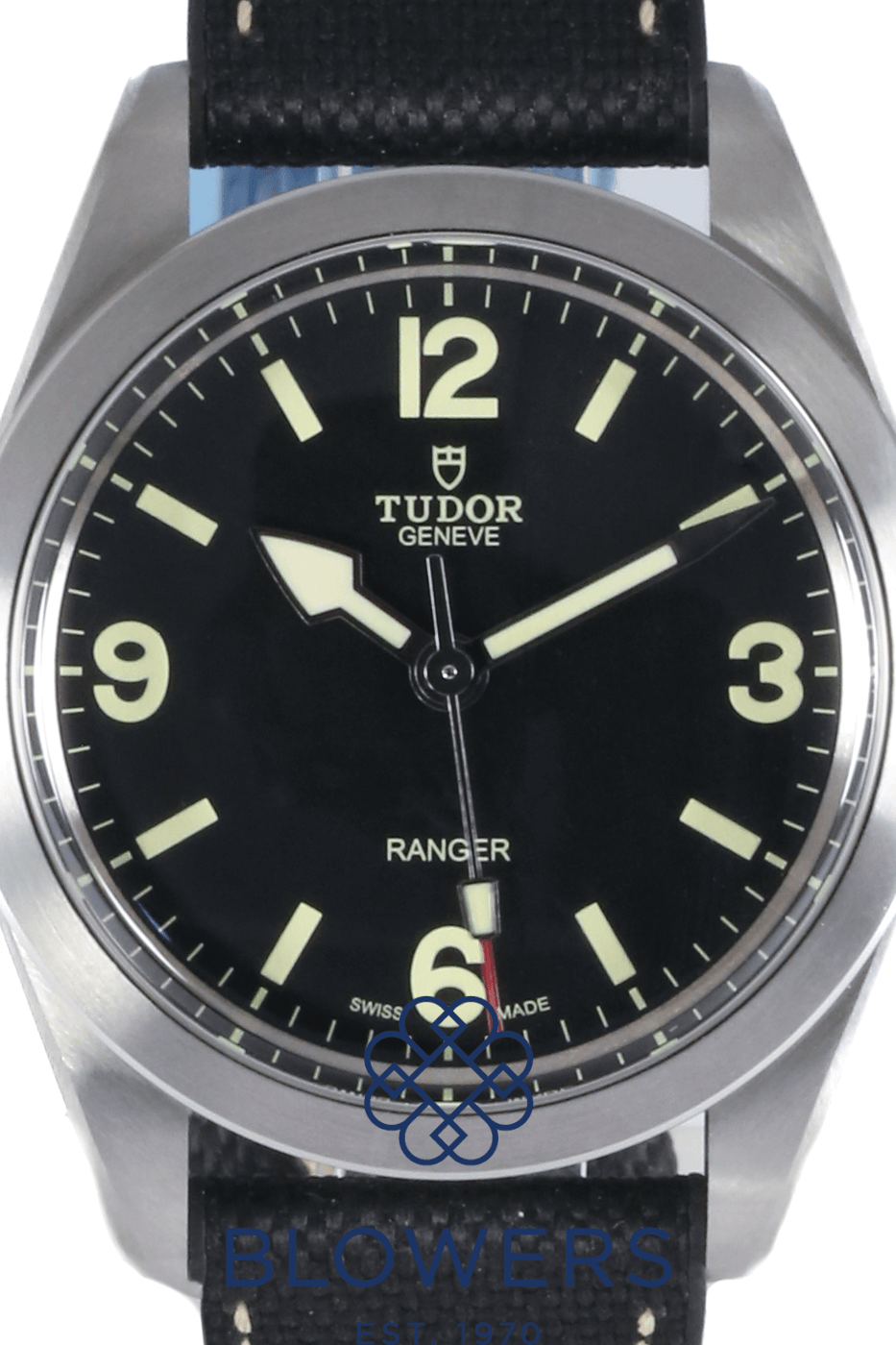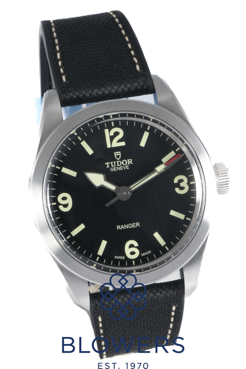 Tudor Ranger M79950. Unworn watch and still in full factory seals. Stainless steel 39mm diameter case with smooth polished and satin finish bezel and screw-down crown, water resistant up to 100 metres. Self-winding chronometer-certified manufacture calibre MT5402 movement, with a 70 hour power reserve. Domed black dial with beige Arabic numerals at 3, 6 and 9 o’clock and luminescent hour markers. Luminescent hands with distinctive arrow hour hand design. Central hours, minutes and seconds hands. Sapphire crystal glass. Textile and rubber strap with folding clasp and steel folding clasp. Additional Green fabric bracelet with red and beige stripes and buckle. Box and papers dated November 2022.