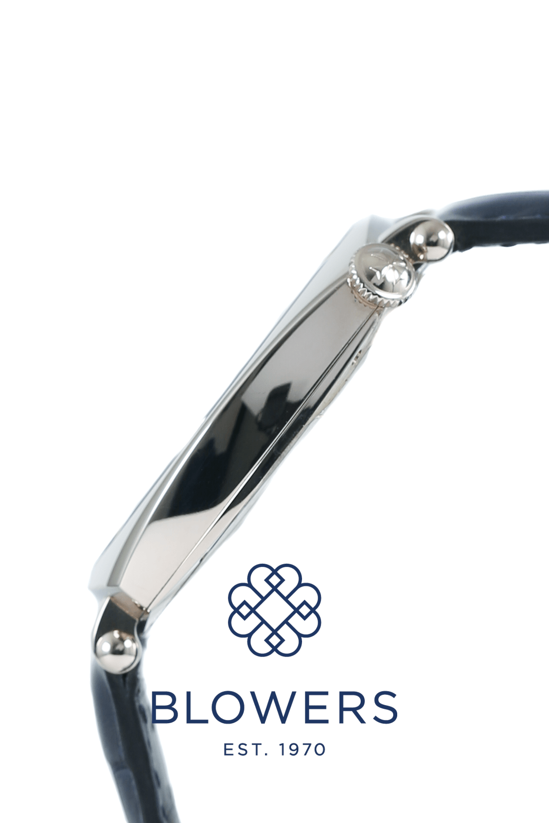 Vacheron Constantin Historiques American 1921 82035/000G-B735. Inspired by the original 1921 model. 18ct white gold casing, a case thickness of 8.06mm. Manual winding, calibre 4400 AS movement, which can be viewed through the transparent case-back. A frequency of 28800 V.P.H, 21 jewels, a power reserve of 65 hours. Brass, railway dial-train silver dial with black Arabic numerals. Central black hours and minutes hands. Small seconds sub-dial featuring between the 3 and 4 o’clock position. Upon a blue alligator leather strap, with a tang buckle. Box and papers dated July 2021.