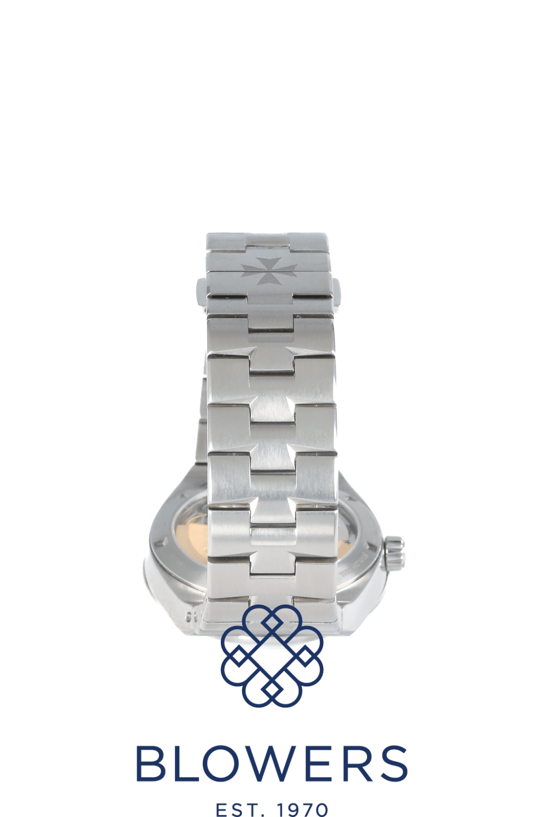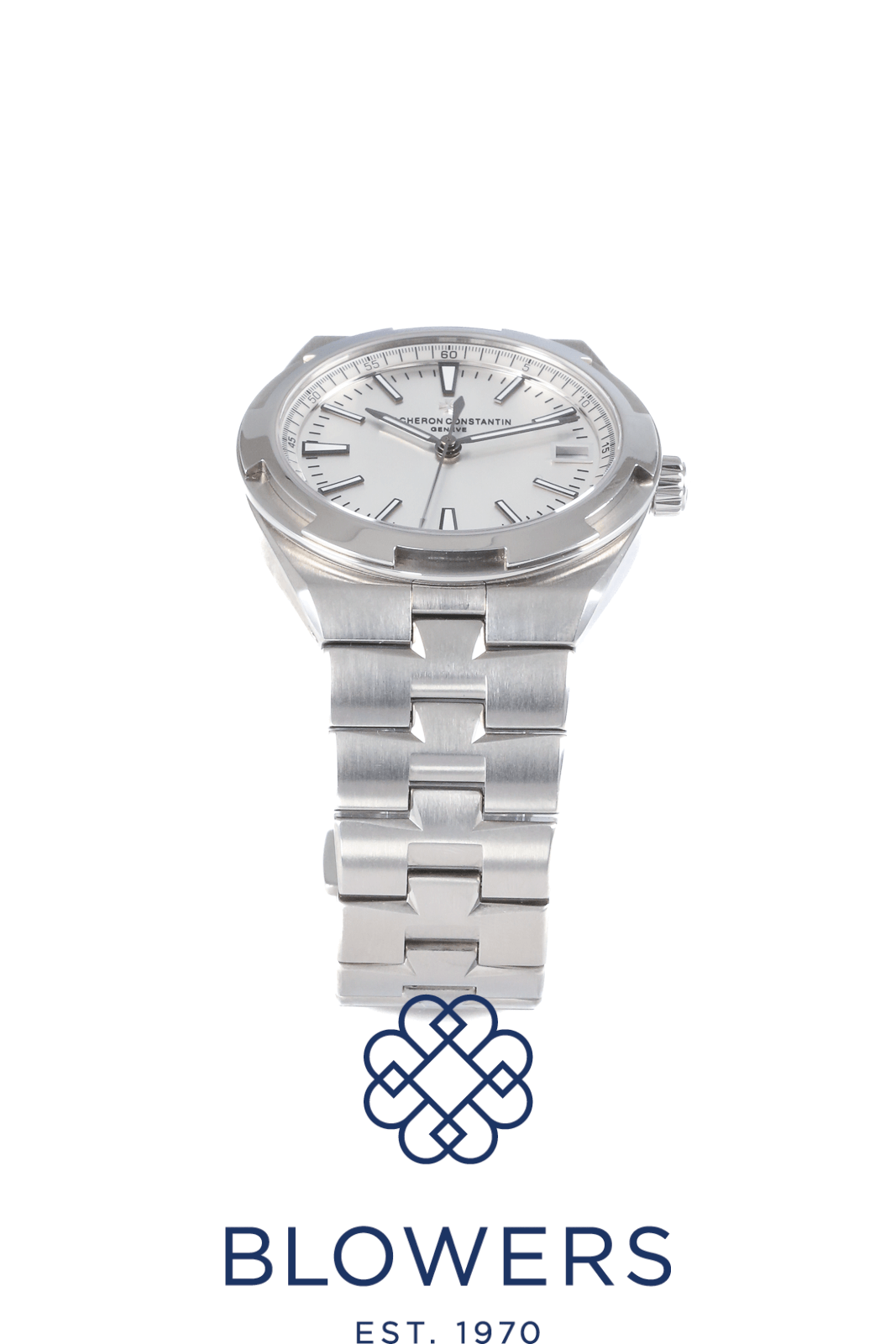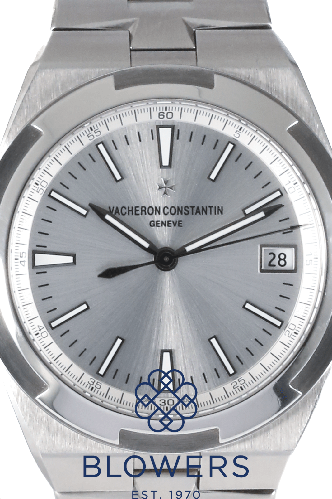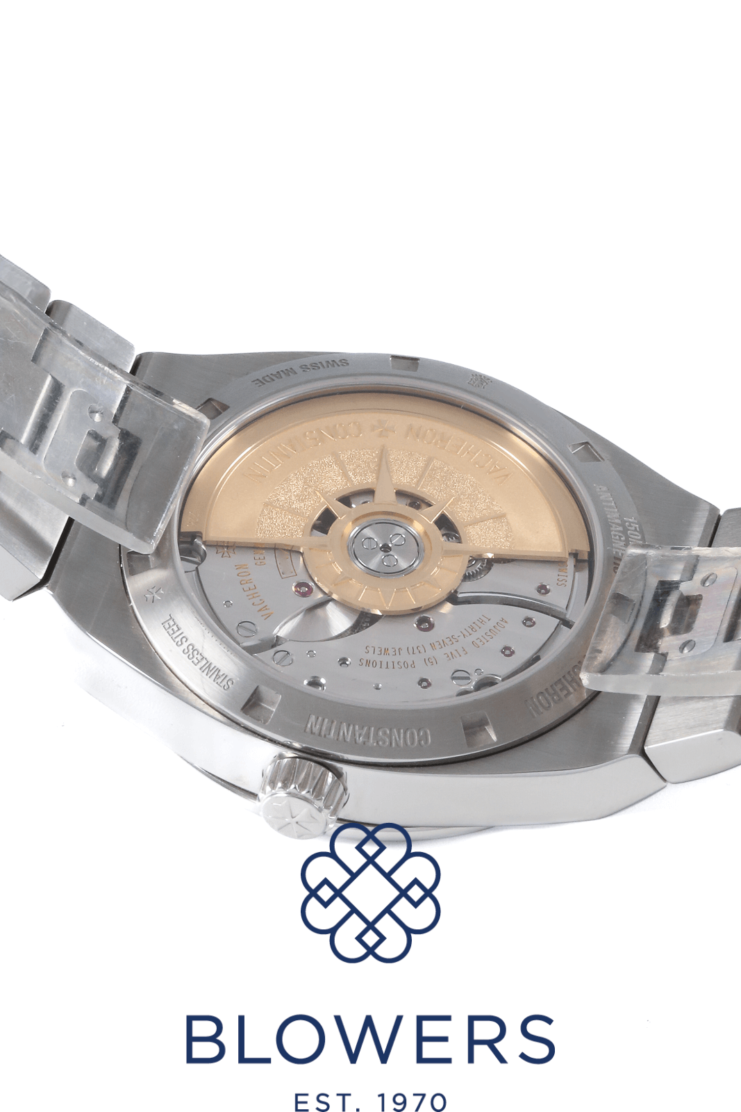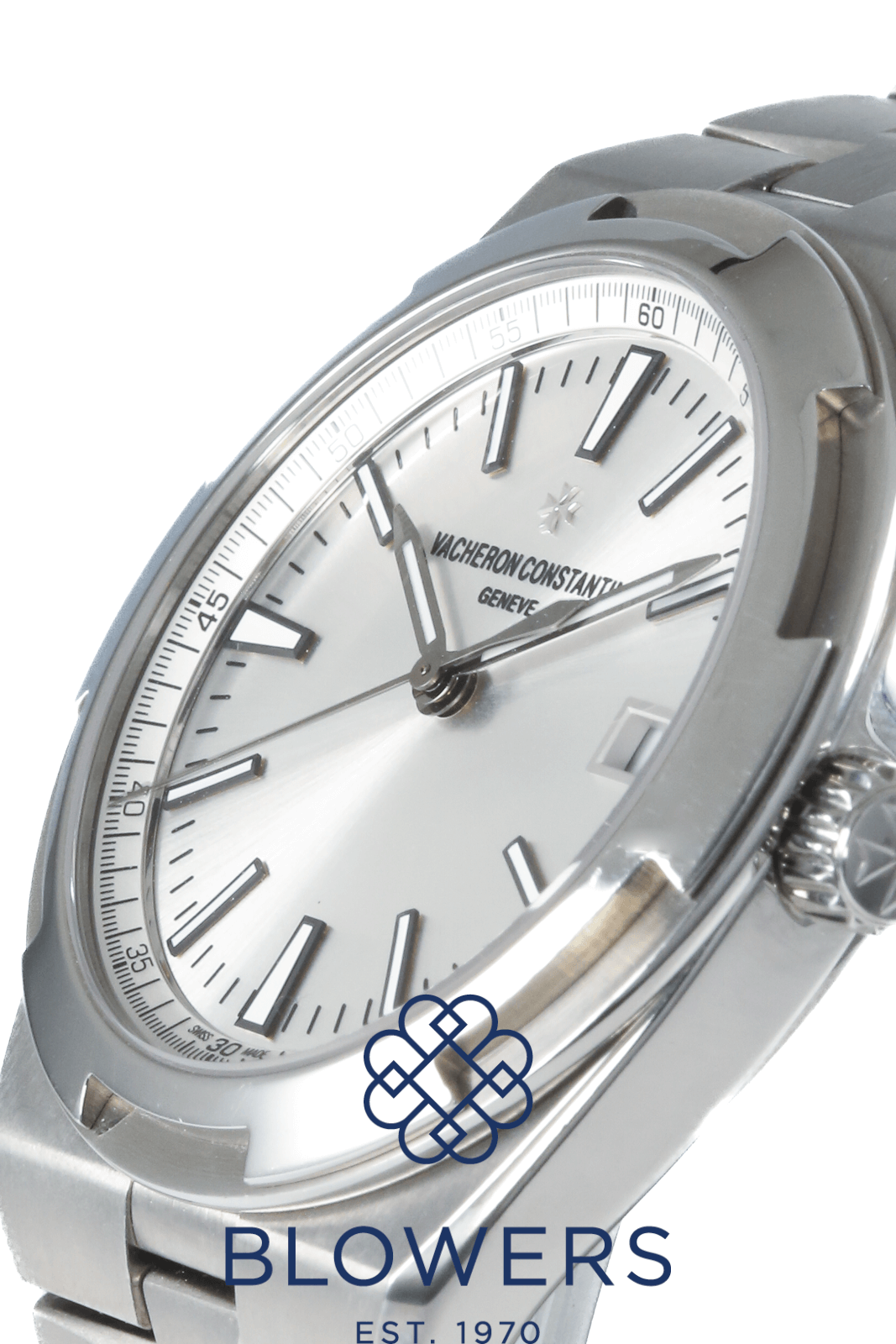 Vacheron Constantin Overseas Automatic 4500V/110A-B126. 41mm brushed stainless steel case with polished finished bevelled corners. Polished stainless steel crown Polished stainless steel bezel. Dial: Silver lacquered dial with a fine sunburst finish. Applied polished darkened white gold index hour markers with luminescent fill. Polished darkened white gold hands. Hour & minute hands with luminescent fill. Fine printed minute track. Matching coloured bezel flange with seconds & fractions-of-a-seconds track. Date window located at the 3 o’clock position. Bracelet/Straps: Stainless steel bracelet with integrated half Maltese cross links. Brushed finished with polished bevelled corner. Movement: Vacheron Constantin in-house Caliber 5100, beats at 28,800 vph, composed out of 172 parts, contains 37 Jewels & has an approximate power reserve of 60 hours. 22kt gold rotor. Comes with an additional Black Crocodile leather Strap and Black Rubber Strap. This watch has a quick release bracelet system allowing you to effortlessly swap between bracelet and straps without the need for tools. Box and papers dated August 2021.