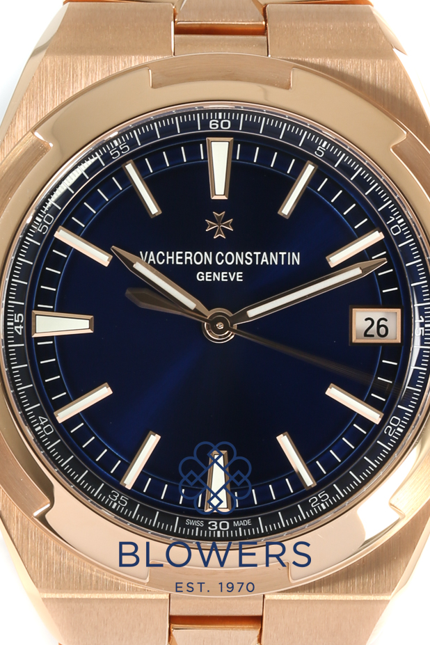 Vacheron Constantin Overseas Automatic 4500V/110R-B705. 41mm brushed 18ct rose gold case with polished finished bevelled corners. Polished rose gold crown and Polished rose gold bezel. Blue dial with a fine sunburst finish. Applied polished rose gold index hour markers with luminescent fill. Rose gold hour & minute hands with luminescent fill. Fine printed outer minute track. Matching coloured bezel flange with seconds & fractions-of-a-seconds track. Date window located at the 3 o’clock position. Rose gold bracelet with a folding clasp. Automatic Movement: Vacheron Constantin in-house Calibre 5100, beats at 28,800 vph, composed out of 172 parts, contains 37 Jewels & has an approximate power reserve of 60 hours. 22kt gold rotor. Box and papers dated June 2022.
