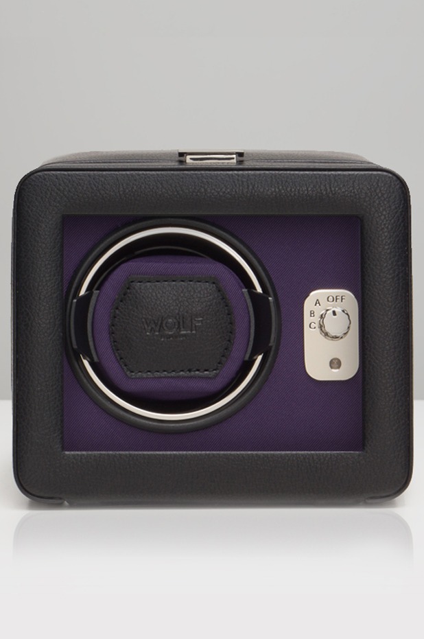 Wolf Windsor Watch Winder with cover in Black & Purple. This single watch winder combines sharp design with smooth edges. This mid-century inspired design includes chrome finished hardware, black pebble faux leather, silver textured silk faceplate and a single winding module.