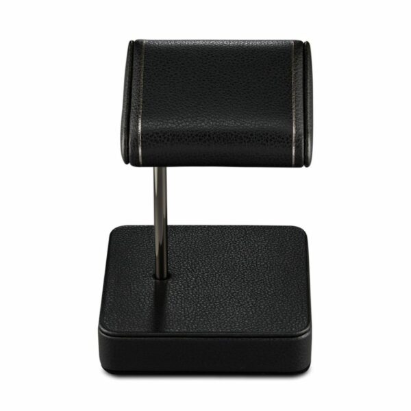 WOLF British Racing Single Static Watch Stand- Black. Display and keep your watch in a scratch free zone on the padded top cushion watch stand. Comes with a secure base designed for those with heavy weight watches. Material: Vegan Leather, Steel pole, Size: 11CM L X 11CM W X 15.5CM H.