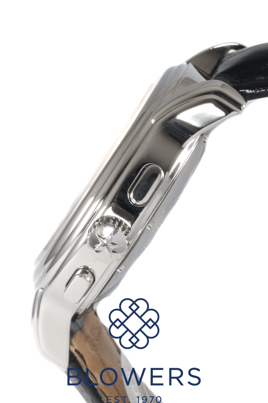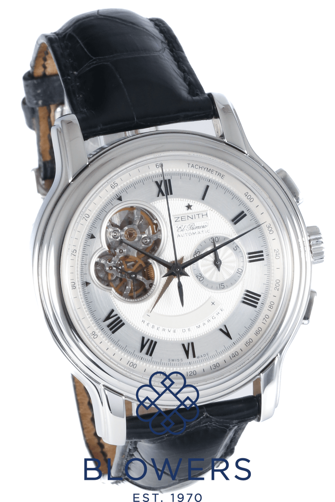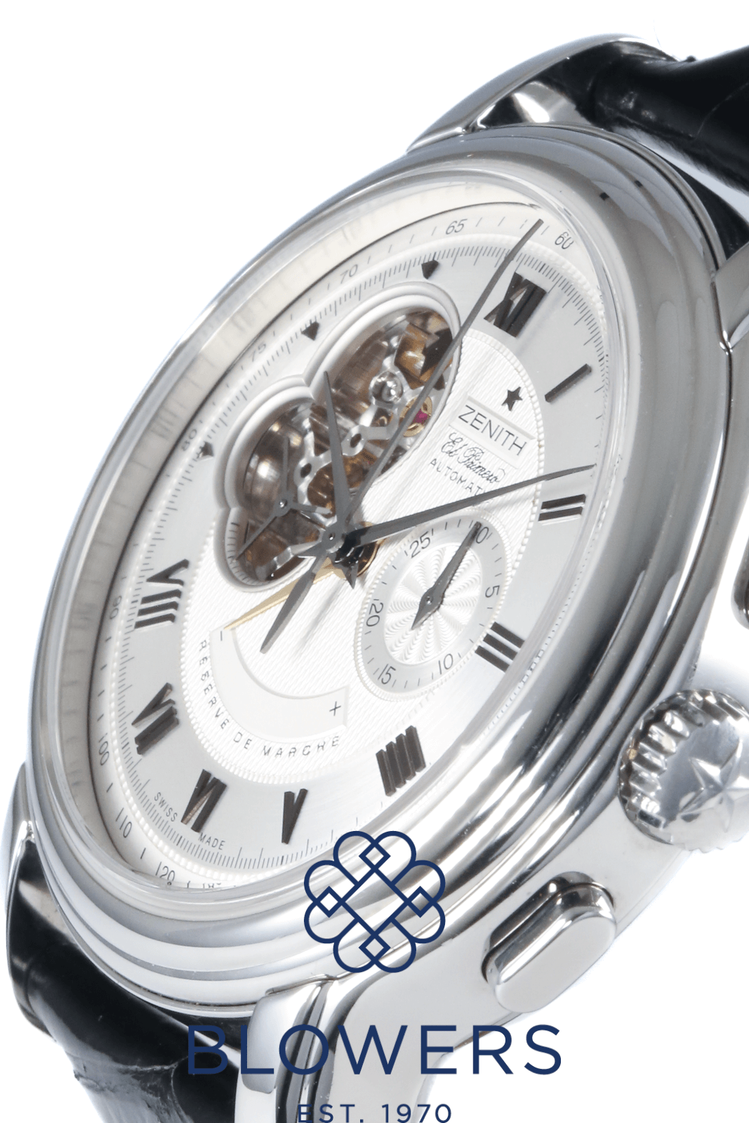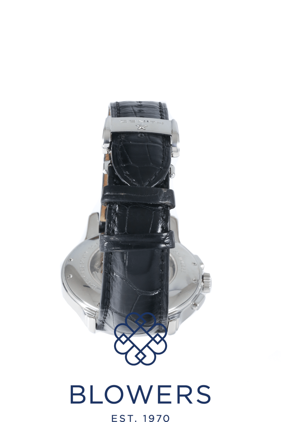 Zenith El Primero Chronomaster 03.1260.4021/02.C505. Automatic. 45mm steel case. Silver dial with Guilloche-textured Centre. Minute sub-dial at 3 o’clock position. Power-reserve display between 5 o’clock and 8 o’clock position. Open display between the 8 o’clock and 12 o’clock position. Black Roman numeral hour markers. Steel hour markers. Tachymeter scale on outer dial. Steel bezel with a smooth polished finish. Open case back display. Black Croc strap with folding clasp. Box and Papers November 2004.